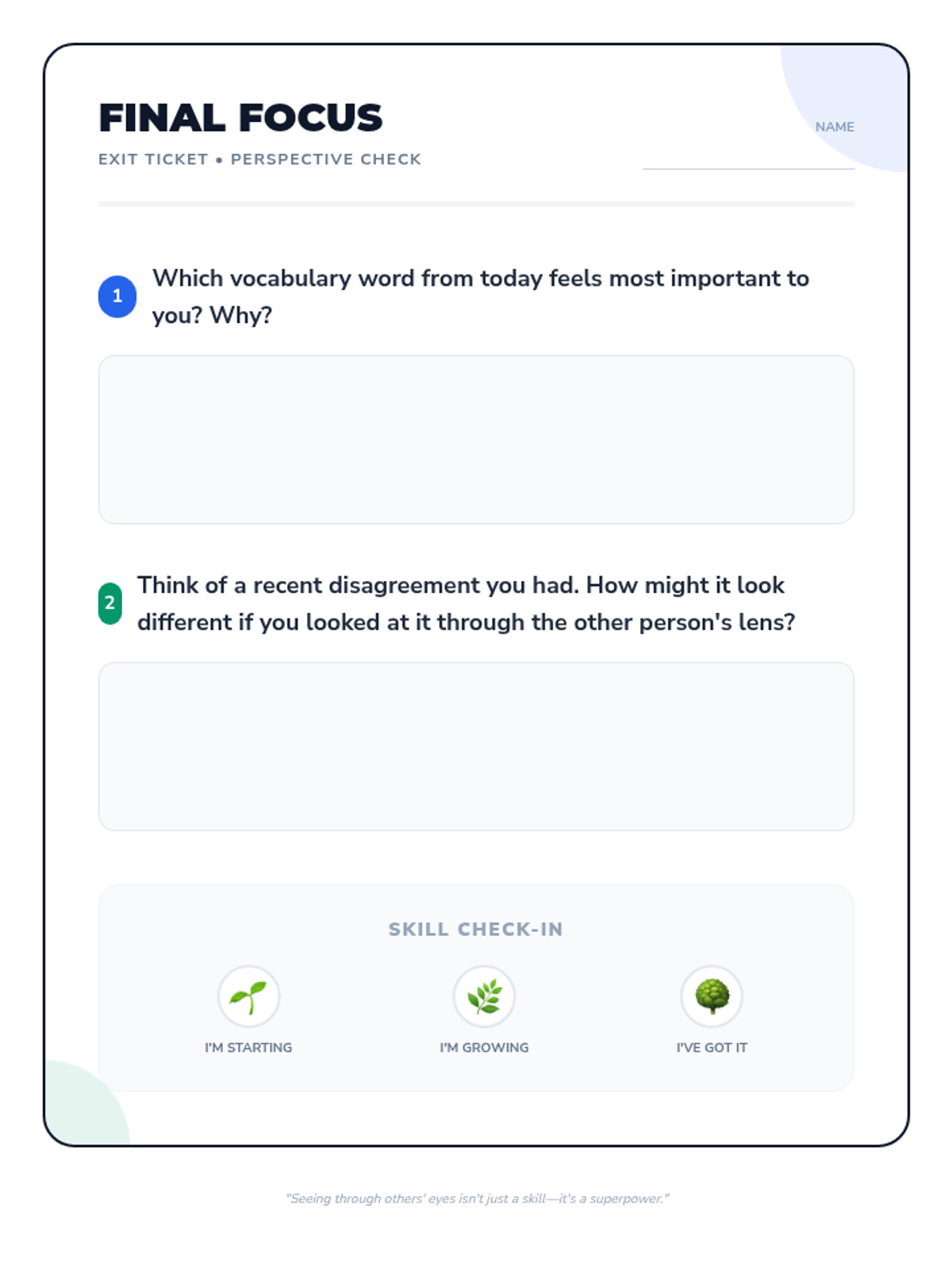 A compact formative assessment (exit ticket) for students to demonstrate understanding of vocabulary and apply perspective-taking to personal experience. Includes a self-assessment scale.