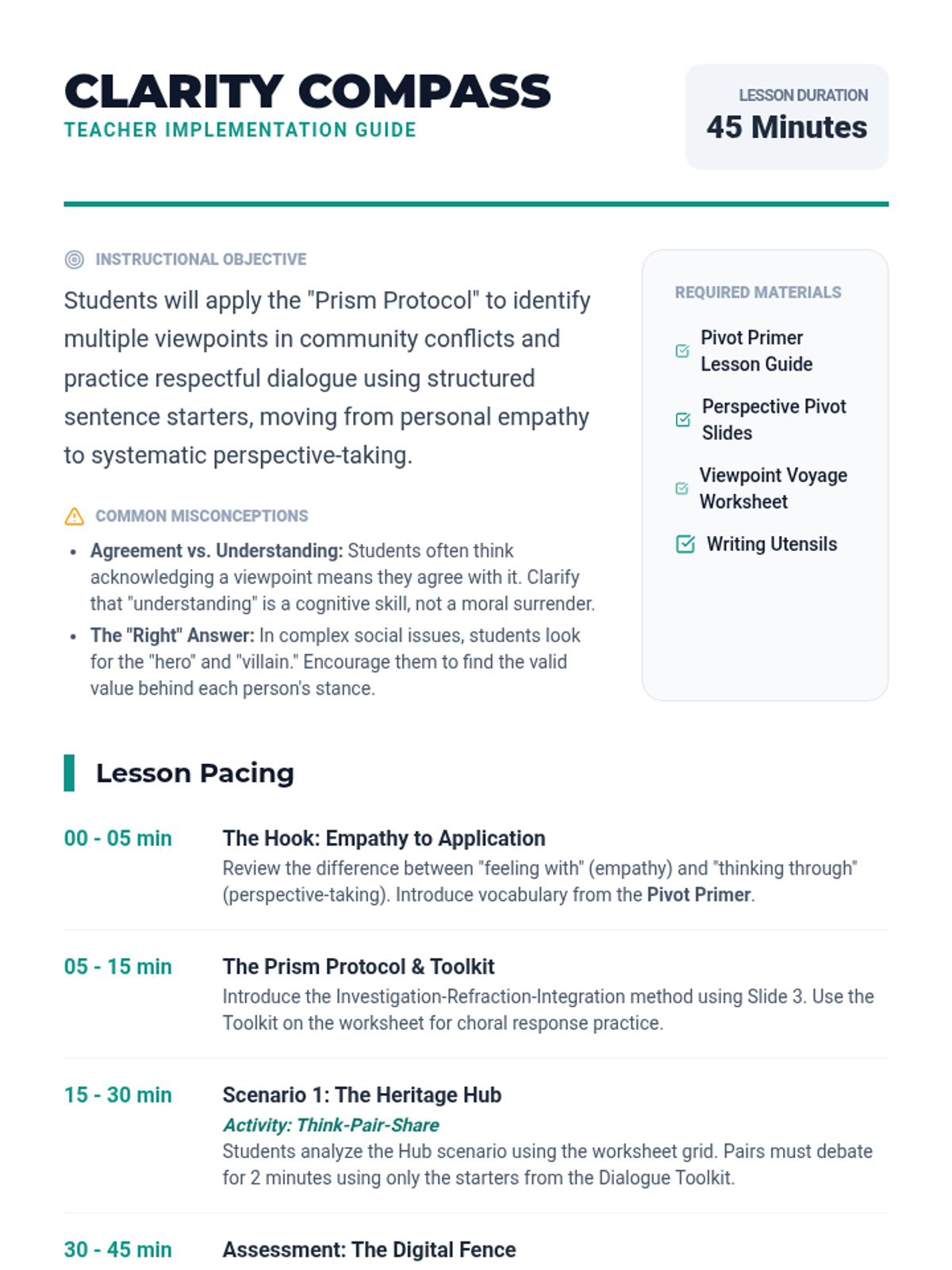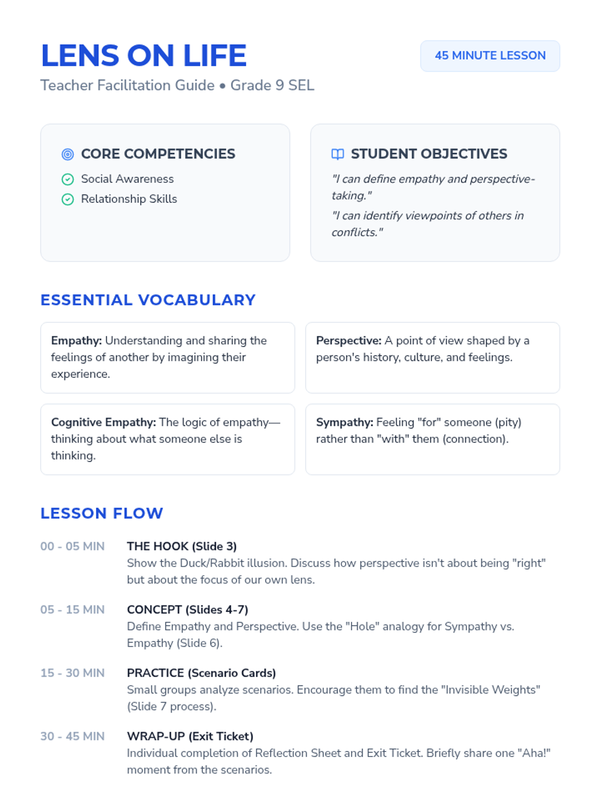 A comprehensive 45-minute lesson guide for teachers, including core competencies, student-friendly objectives, key vocabulary definitions, a detailed pacing guide, and differentiation strategies for Grade 9 SEL.