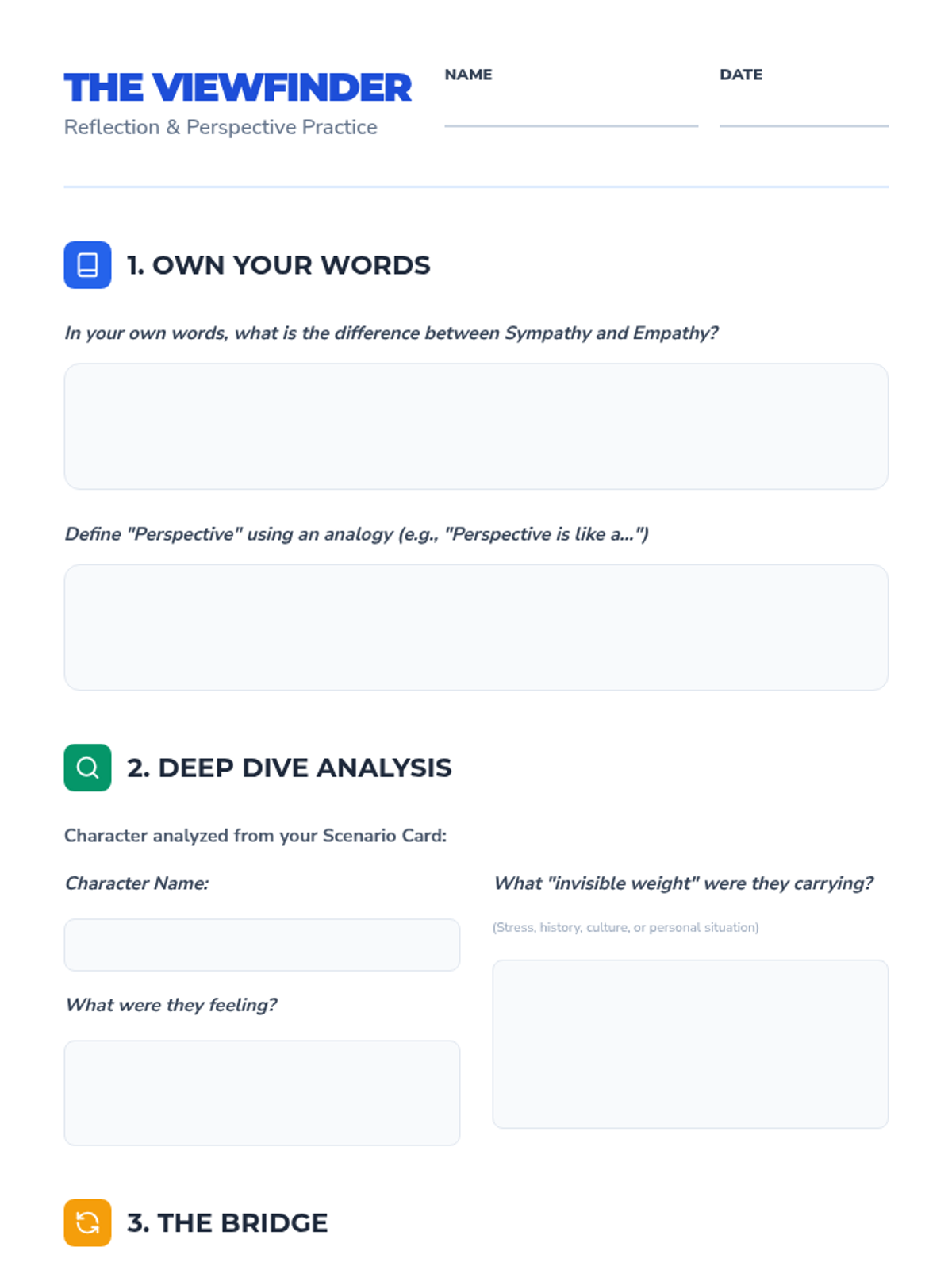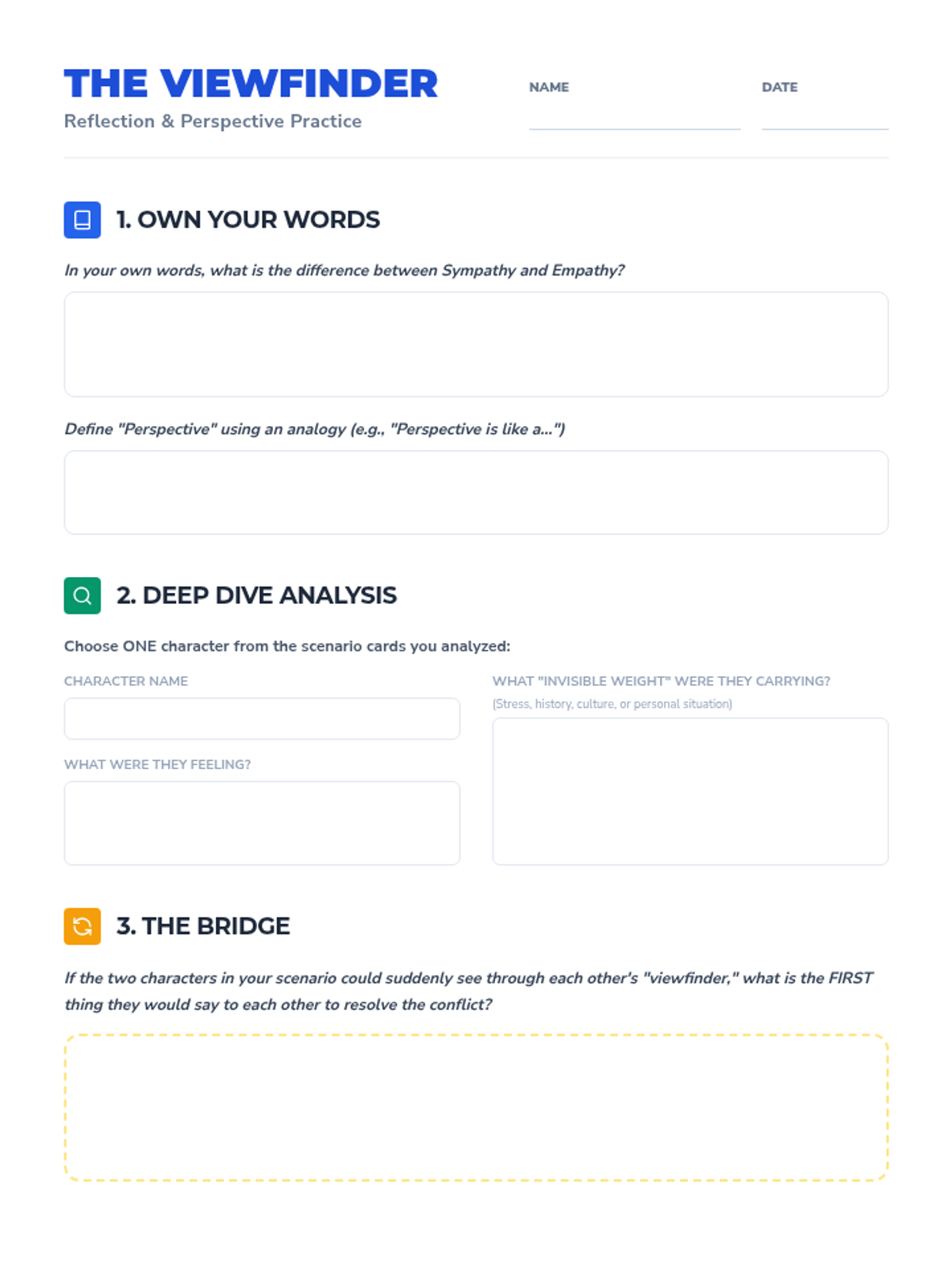 A single-page student reflection worksheet that reinforces vocabulary and includes structured analysis for deeper empathy practice.
