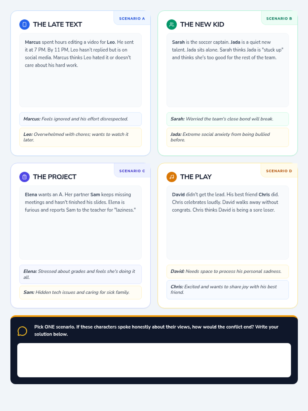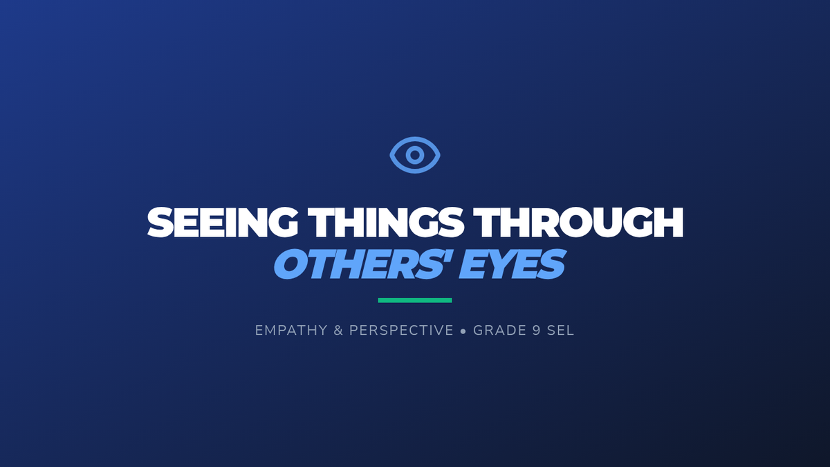 An engaging slide presentation for Grade 9 SEL. Features visual motifs, vocabulary definitions, and scenario analysis prompts to scaffold empathy and perspective-taking skills.
