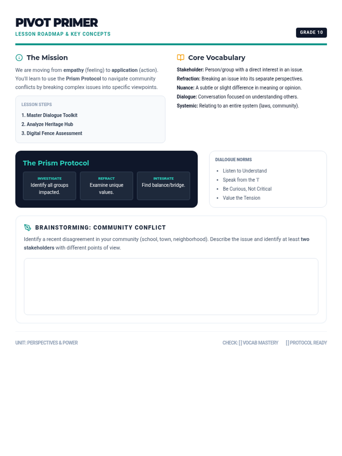 A student-facing introductory guide that provides a lesson roadmap, five core vocabulary definitions, and an overview of the Prism Protocol for community perspective-taking.