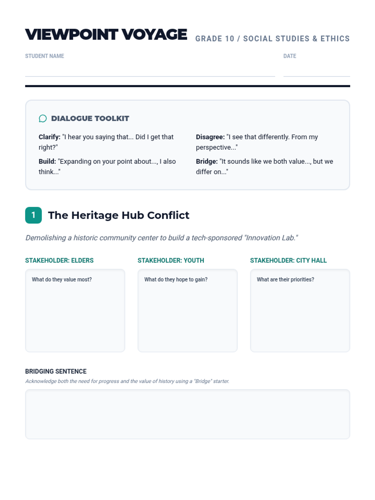 A two-page student worksheet featuring scenario analysis grids, a dialogue toolkit quick-reference, and a formative assessment on balancing conflicting community values.