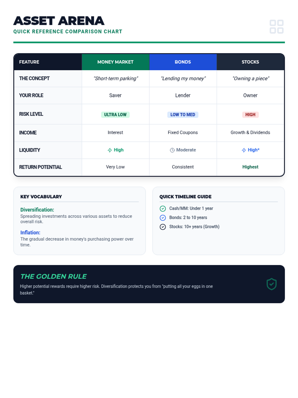 A quick-reference comparison chart summarizing the differences between stocks, bonds, and money market accounts for student reference.