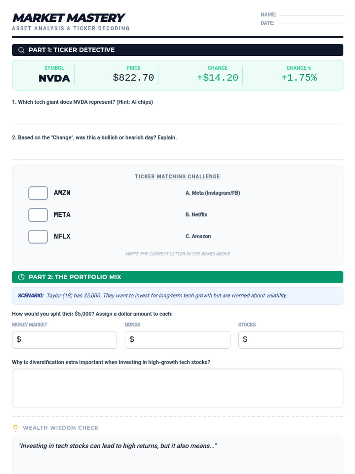 A student worksheet for practicing stock ticker interpretation and designing a basic investment portfolio based on a specific risk profile.