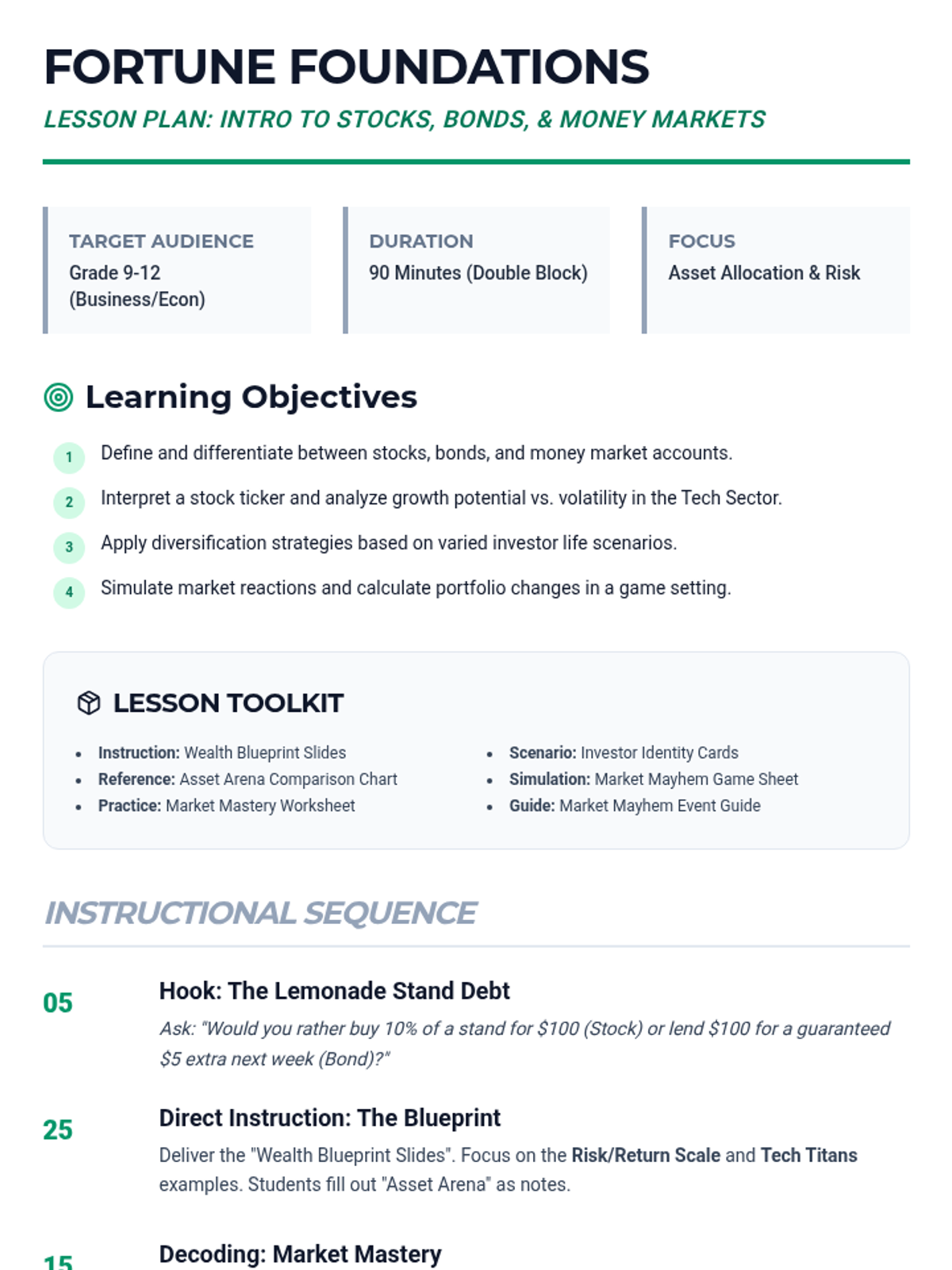 A comprehensive lesson plan for teachers covering the basics of stocks, bonds, and money market accounts, including instructional timing, objectives, and activity guides.