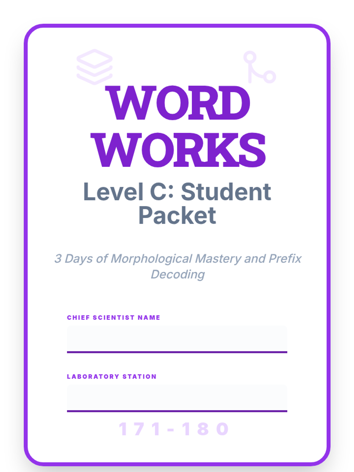 A consolidated student packet for Level C students (171-180), featuring all 3 days of 'Word Works Lab' missions and a cover page. REVISED: Fixed page breaks and added synthesis conclusion areas.