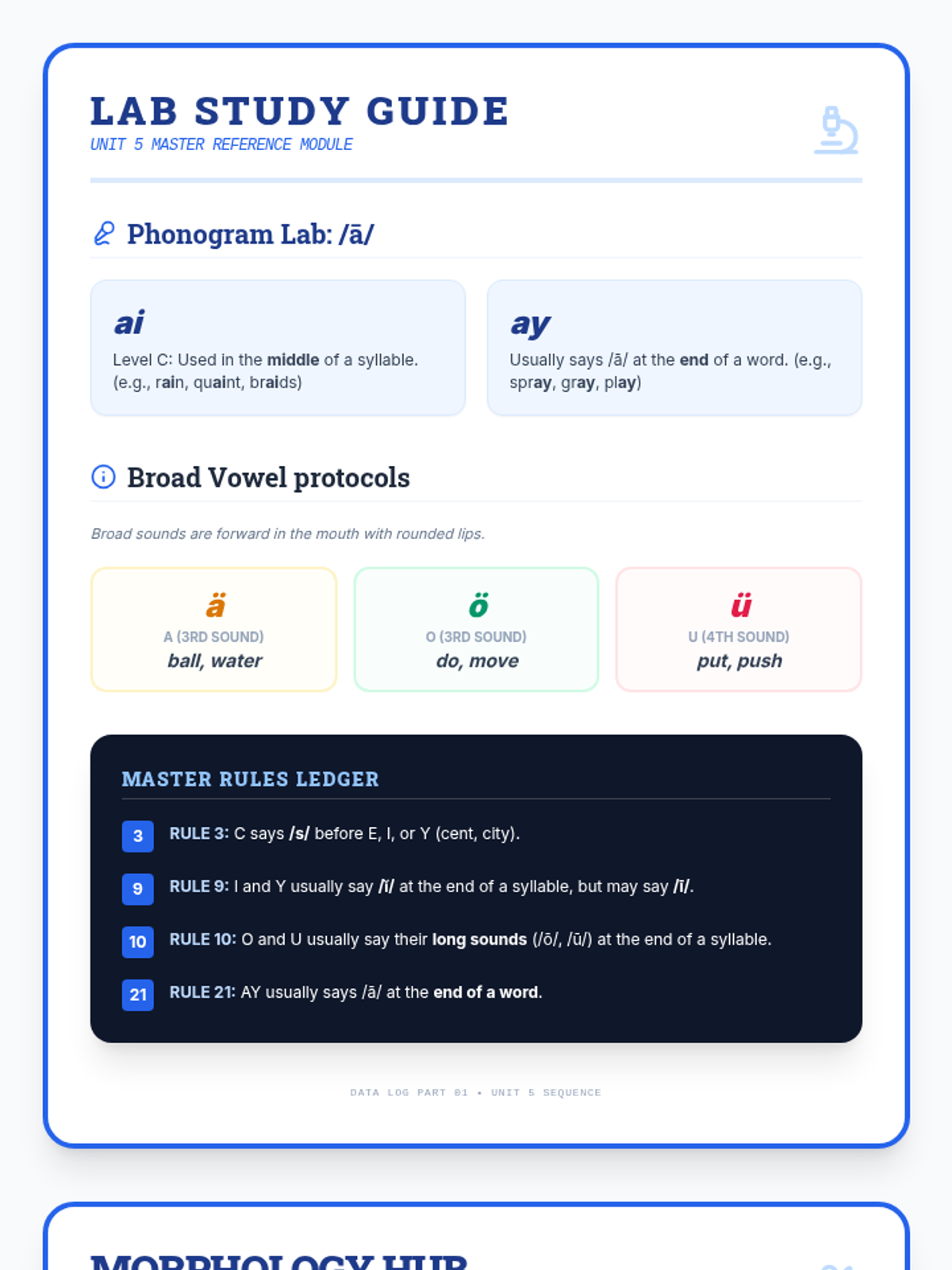 A two-page comprehensive study guide covering the Unit 5 mechanics. Includes phonogram rules for AI and AY, broad vowel marking, spelling rules 3, 9, 10, and 21, Latin morpheme meanings, compound words, and irregular plurals. Features a professional blueprint lab theme. Revised for perfect single-page printing per page.