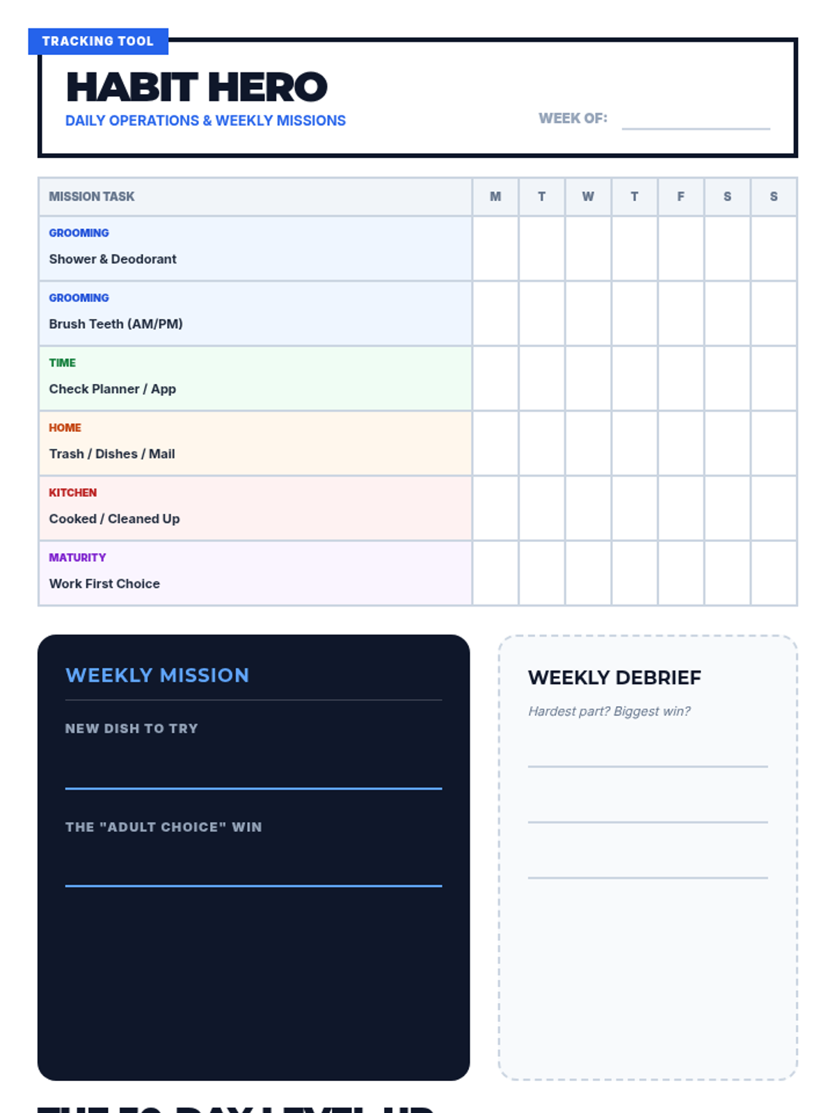 A practical daily and weekly tracking tool for 14-year-old boys to monitor their progress in hygiene, time management, and home responsibilities. It includes a structured goal-setting section for long-term habit formation.