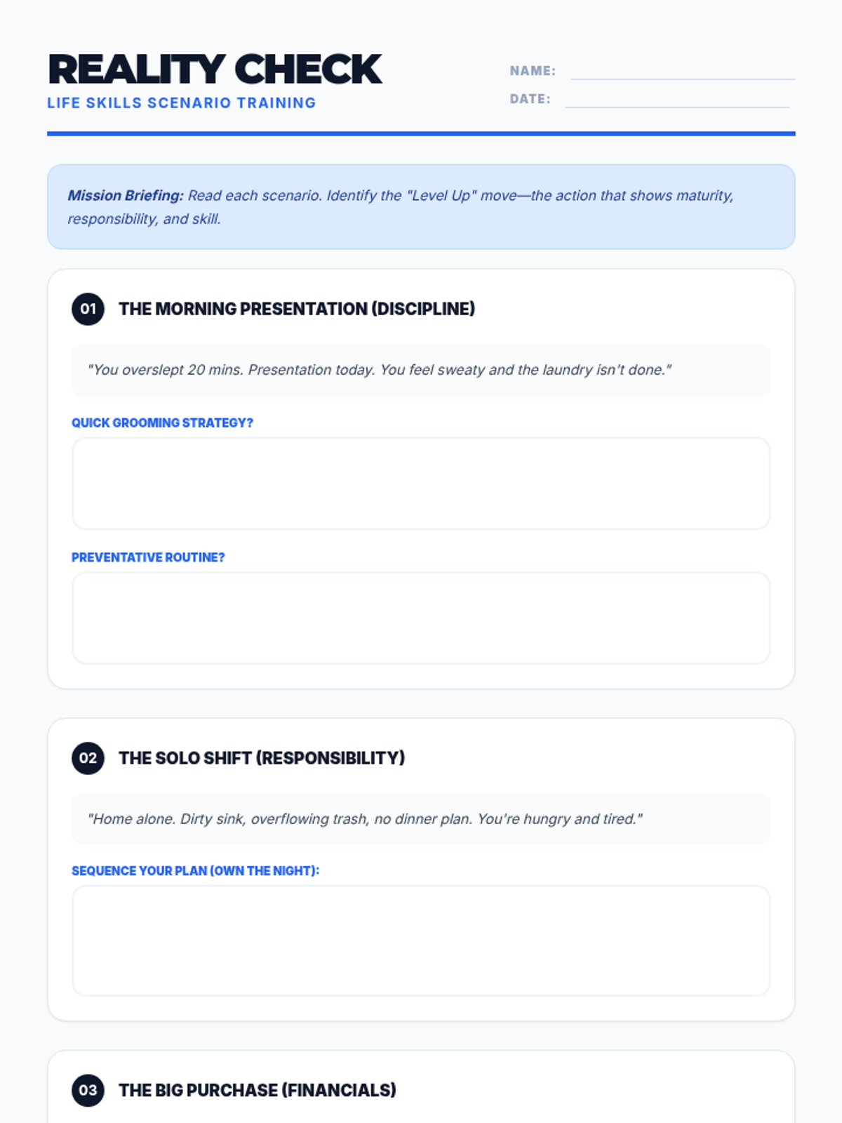 A scenario-based worksheet for 14-year-old boys that presents real-world challenges related to hygiene, time management, home life, and accountability. It provides ample writing space for students to brainstorm mature solutions.