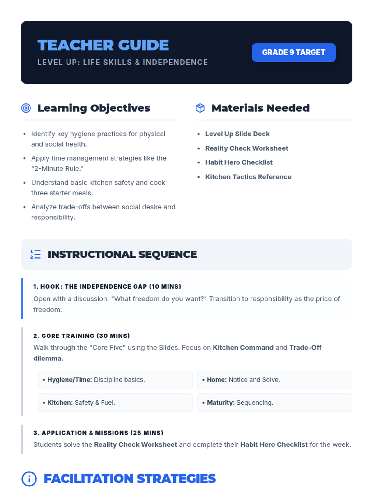 A comprehensive teacher guide for delivering the Level Up life skills lesson. It includes learning objectives, a detailed instructional sequence, facilitation tips for engaging teen boys, and strategic discussion prompts.