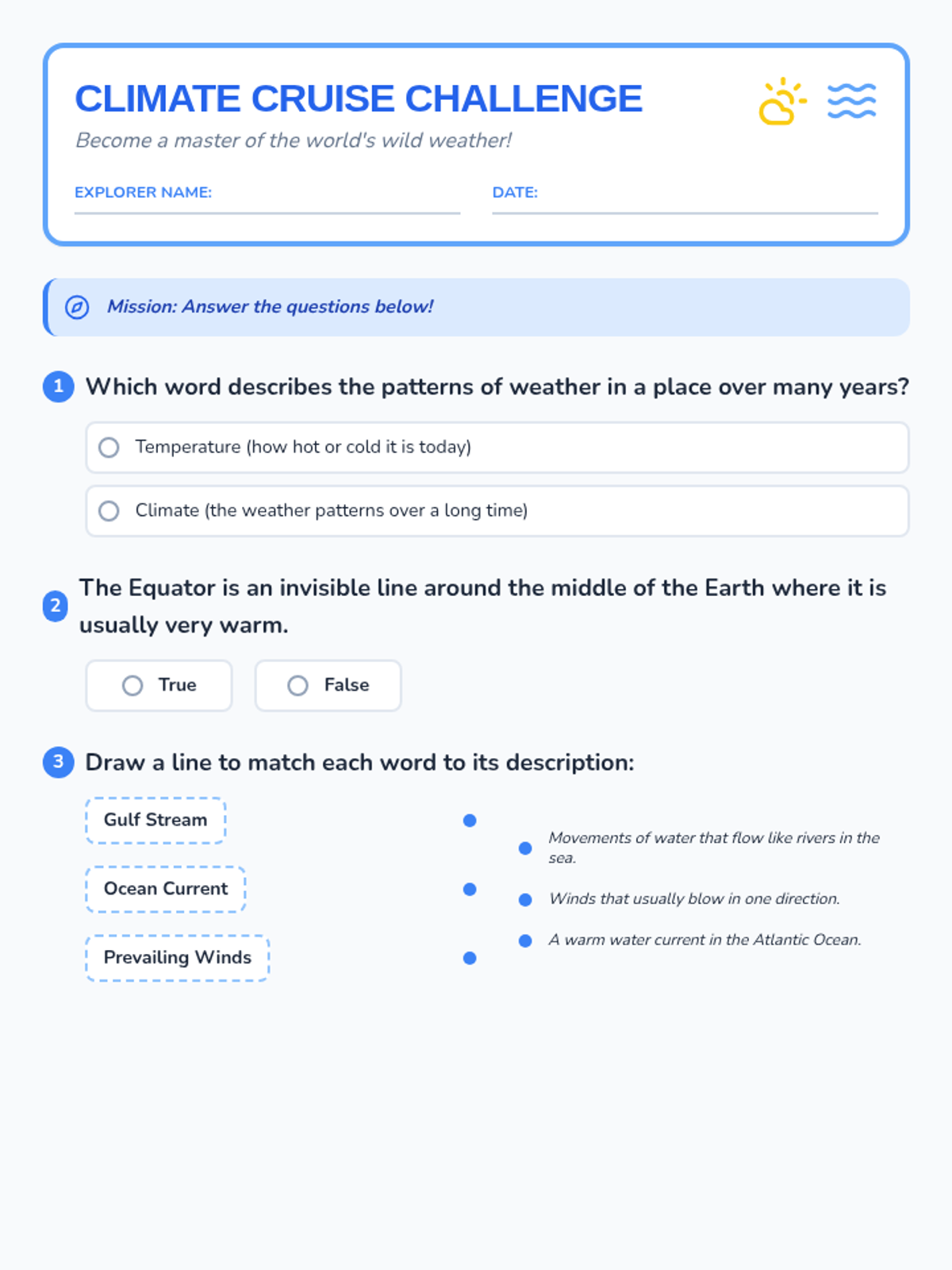 A colorful and engaging 2nd-grade worksheet about climate, weather, and ocean currents. It includes multiple choice, matching, and short answer questions specifically covering the equator, Gulf Stream, and El Niño with a clear page break.