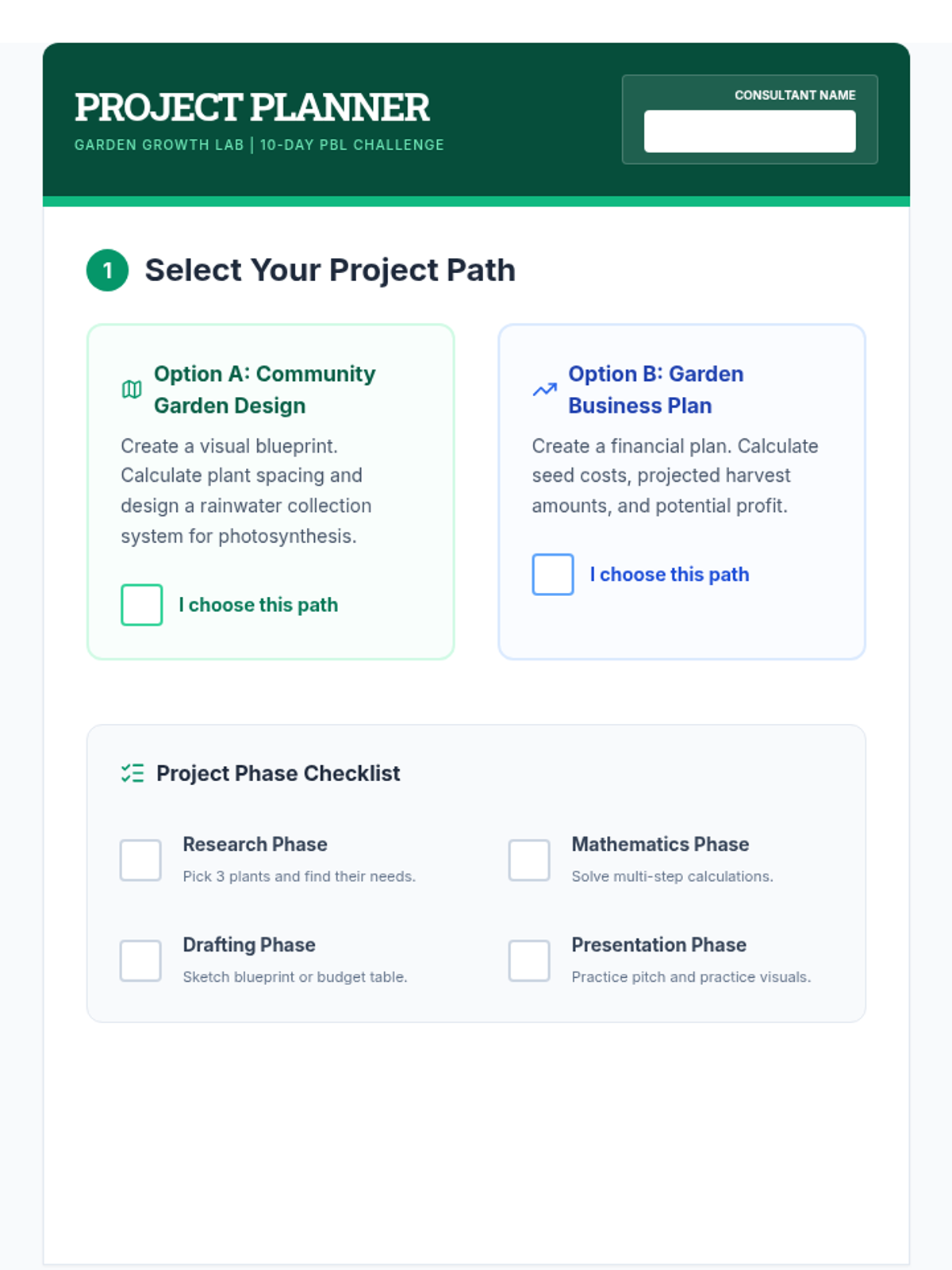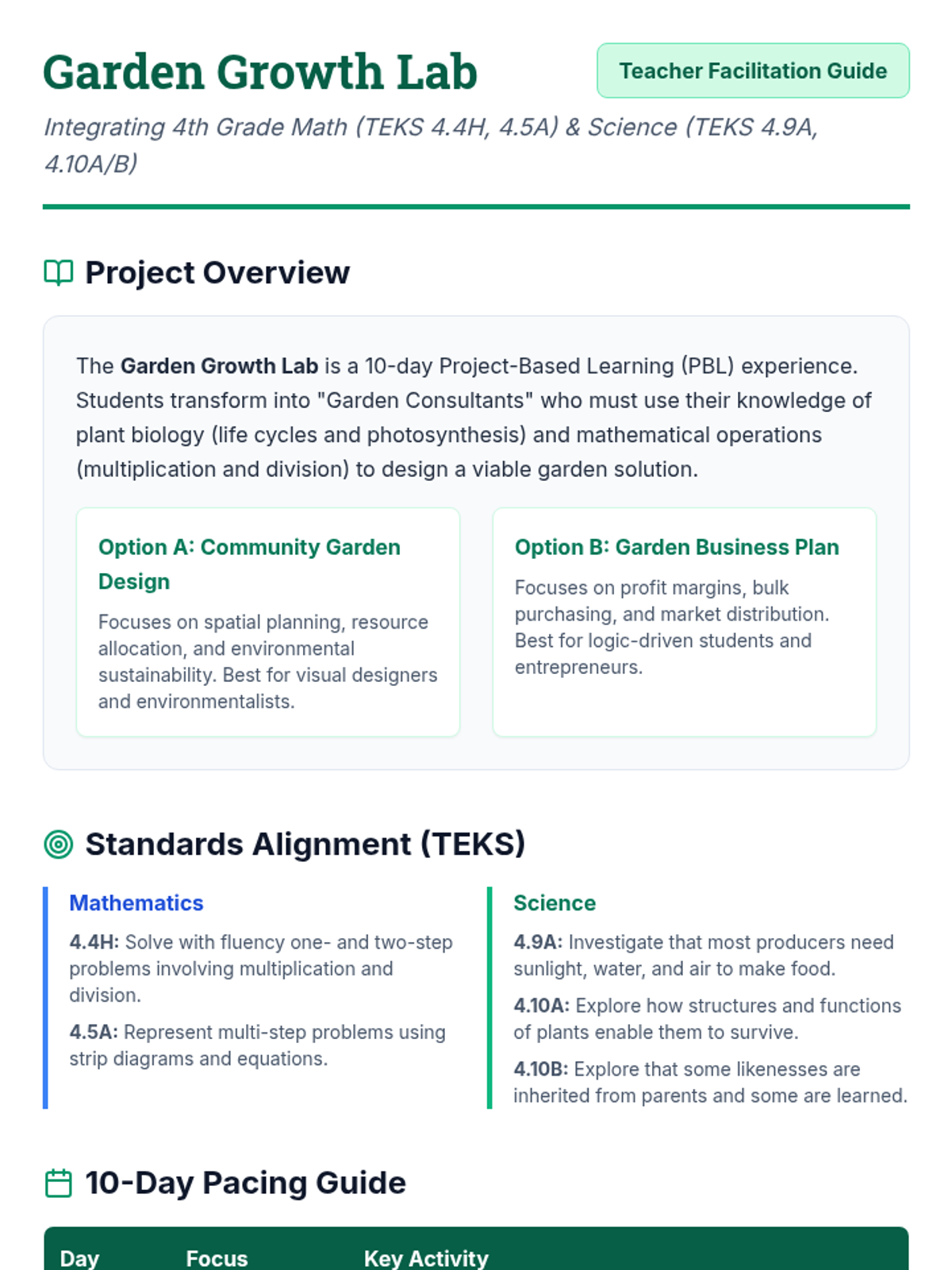 A comprehensive teacher's guide for the 10-day Garden Growth Lab PBL, including TEKS alignment, daily pacing, and project overview. Revised for better layout and orphans.