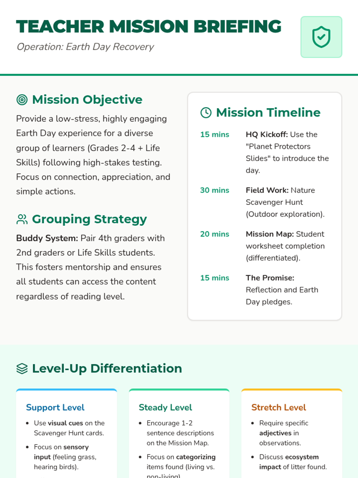 A comprehensive facilitation guide for teachers to manage a differentiated Earth Day activity day, including grouping strategies, timelines, and specific tips for supporting life skills and multi-grade students.