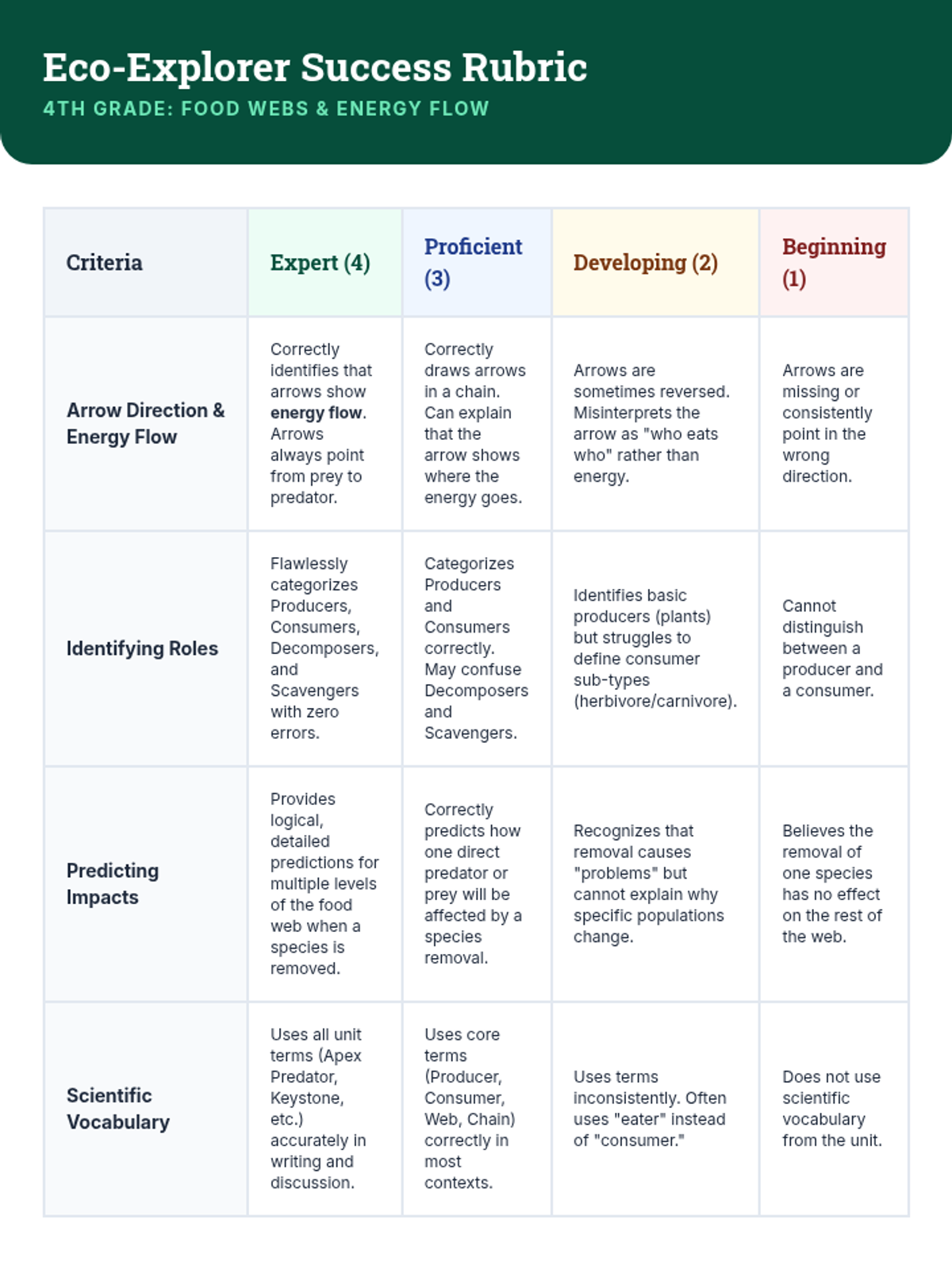 A detailed grading rubric for teachers to assess 4th-grade students on their understanding of food webs, energy flow, organism roles, and ecosystem impacts.