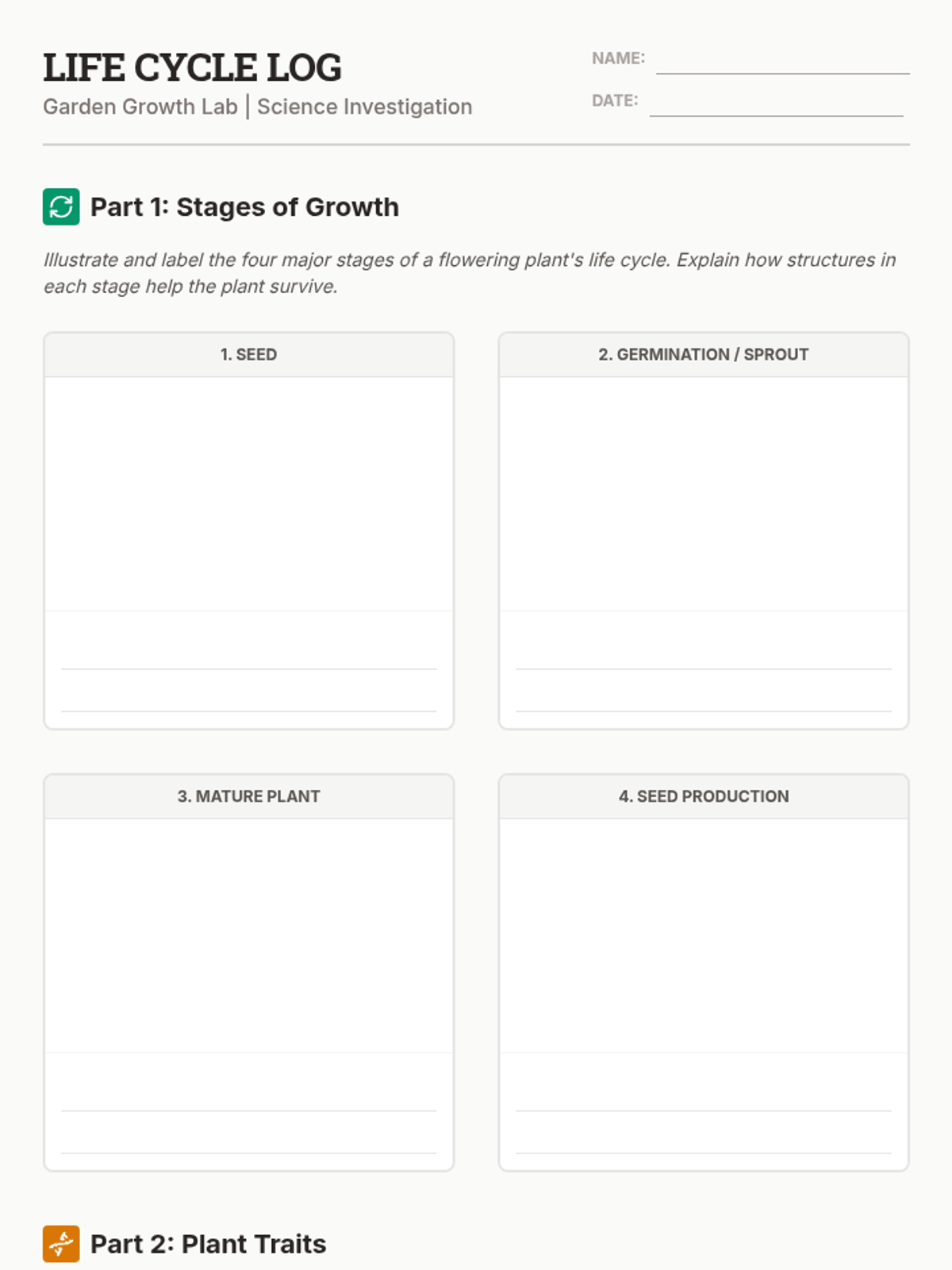 A science-focused worksheet where students diagram plant life cycles and differentiate traits. Revised with larger work areas and improved layout to prevent orphans.