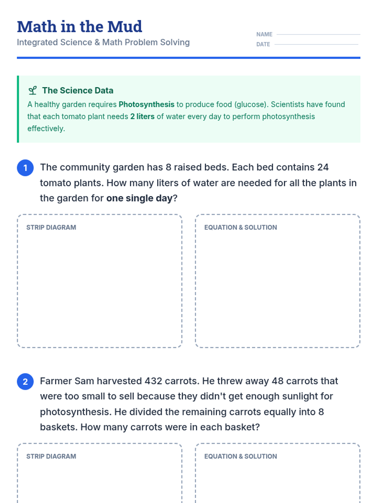 A math worksheet featuring multi-step problems integrated with science concepts (photosynthesis). Revised to keep work areas together and enhance science connections.