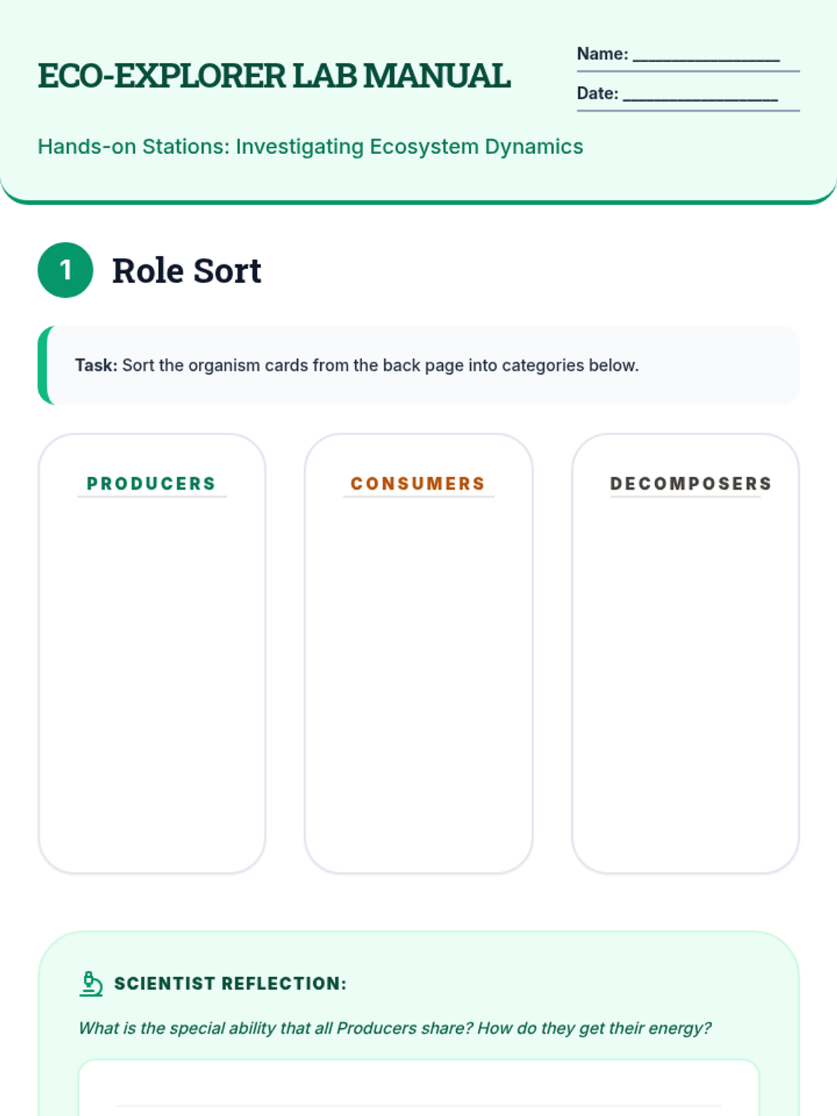 A four-station hands-on activity manual for 4th-grade students to explore organism roles, arrow direction, food web construction, and the impact of species removal. Now with writing guides and improved card layout.