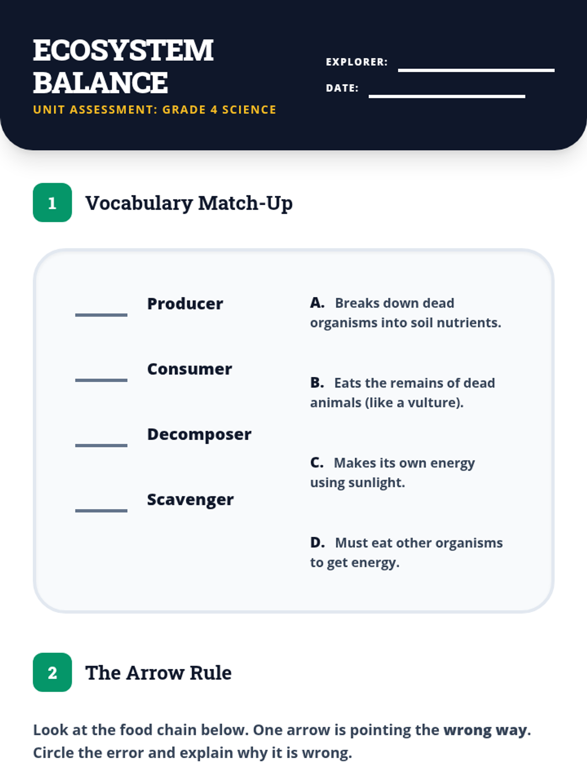 A unit assessment for 4th-grade science covering producer/consumer roles, arrow directionality in food chains, web analysis, and predictive thinking regarding ecosystem changes. Features high-contrast handwriting guides and improved logical grouping.