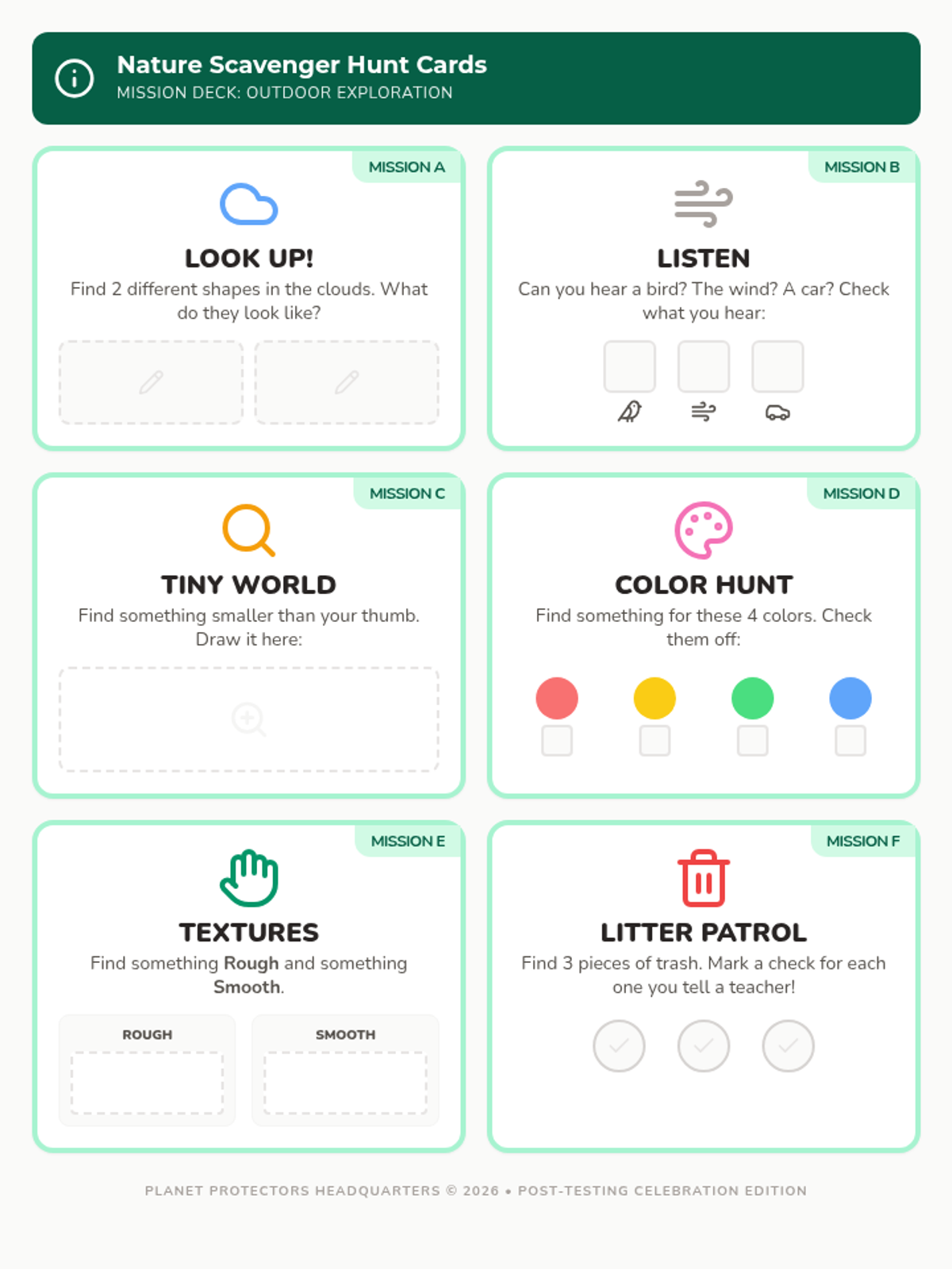 Printable scavenger hunt cards designed for outdoor or indoor exploration. Features heavy visual cues and sensory-based missions accessible for life skills and primary students.