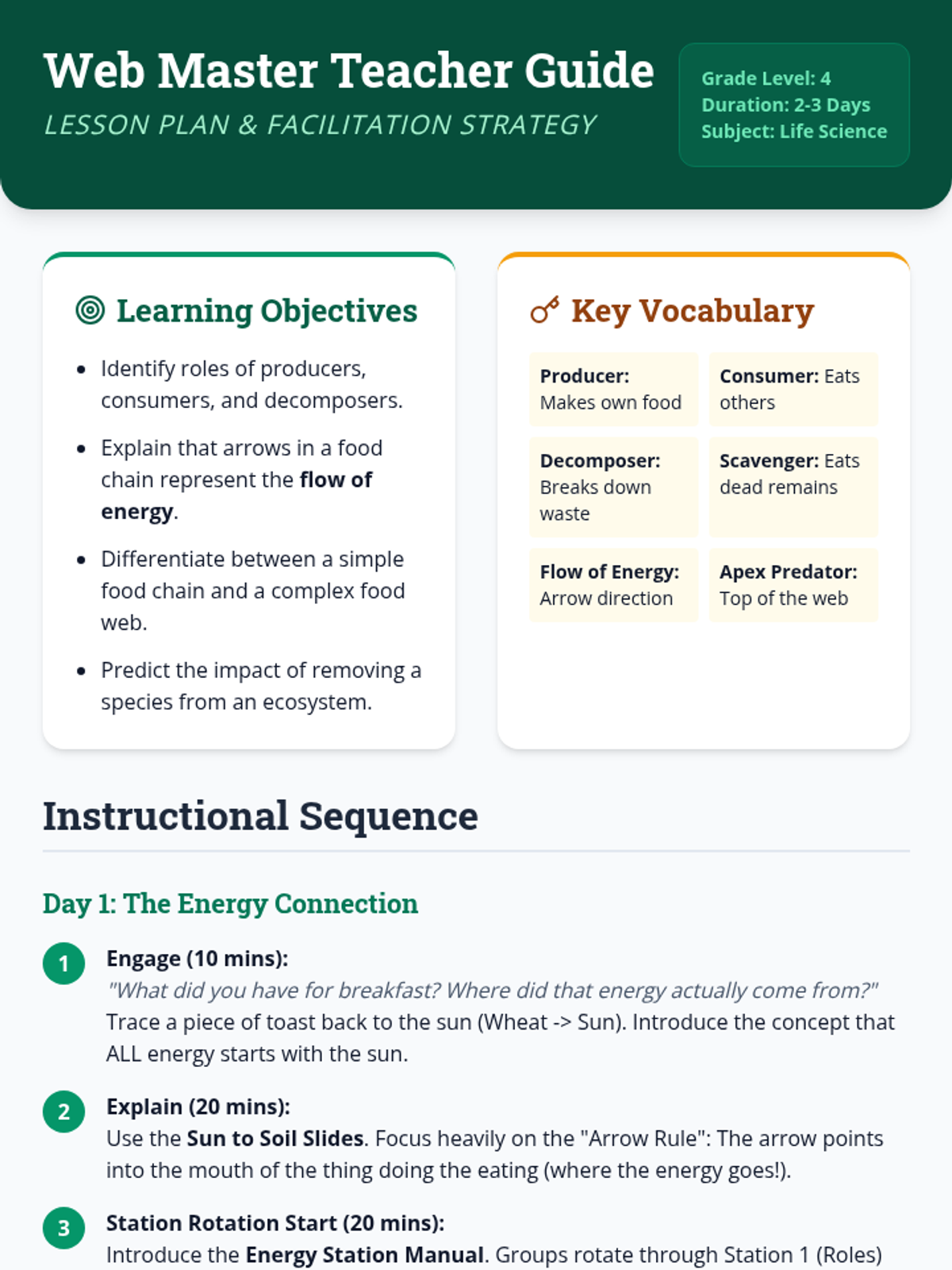 A comprehensive teacher's guide and lesson plan for a 4th-grade unit on food webs, including learning objectives, daily instructional sequences, common misconceptions, and differentiation strategies.