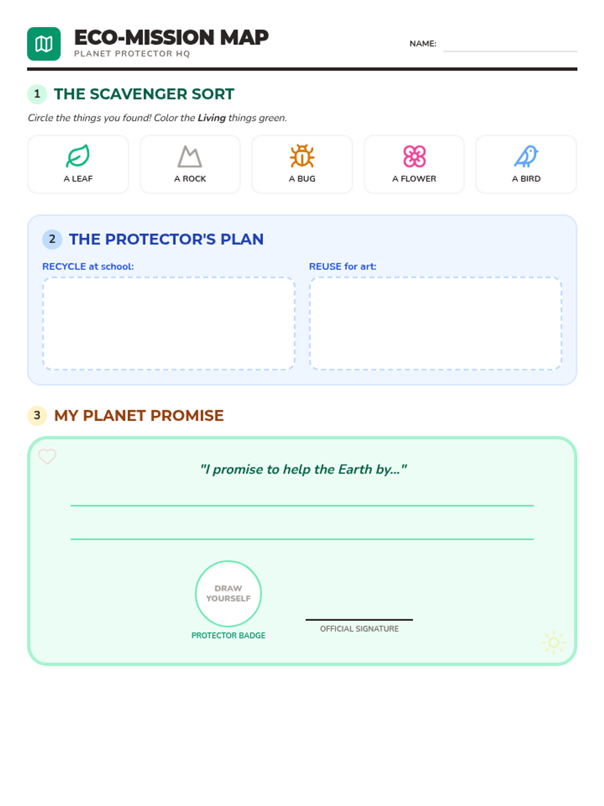A highly visual and differentiated worksheet for multi-grade students to document their Earth Day missions, including a scavenger hunt checklist, a 'Reduce/Reuse' brainstorm area, and a formal Earth Pledge.