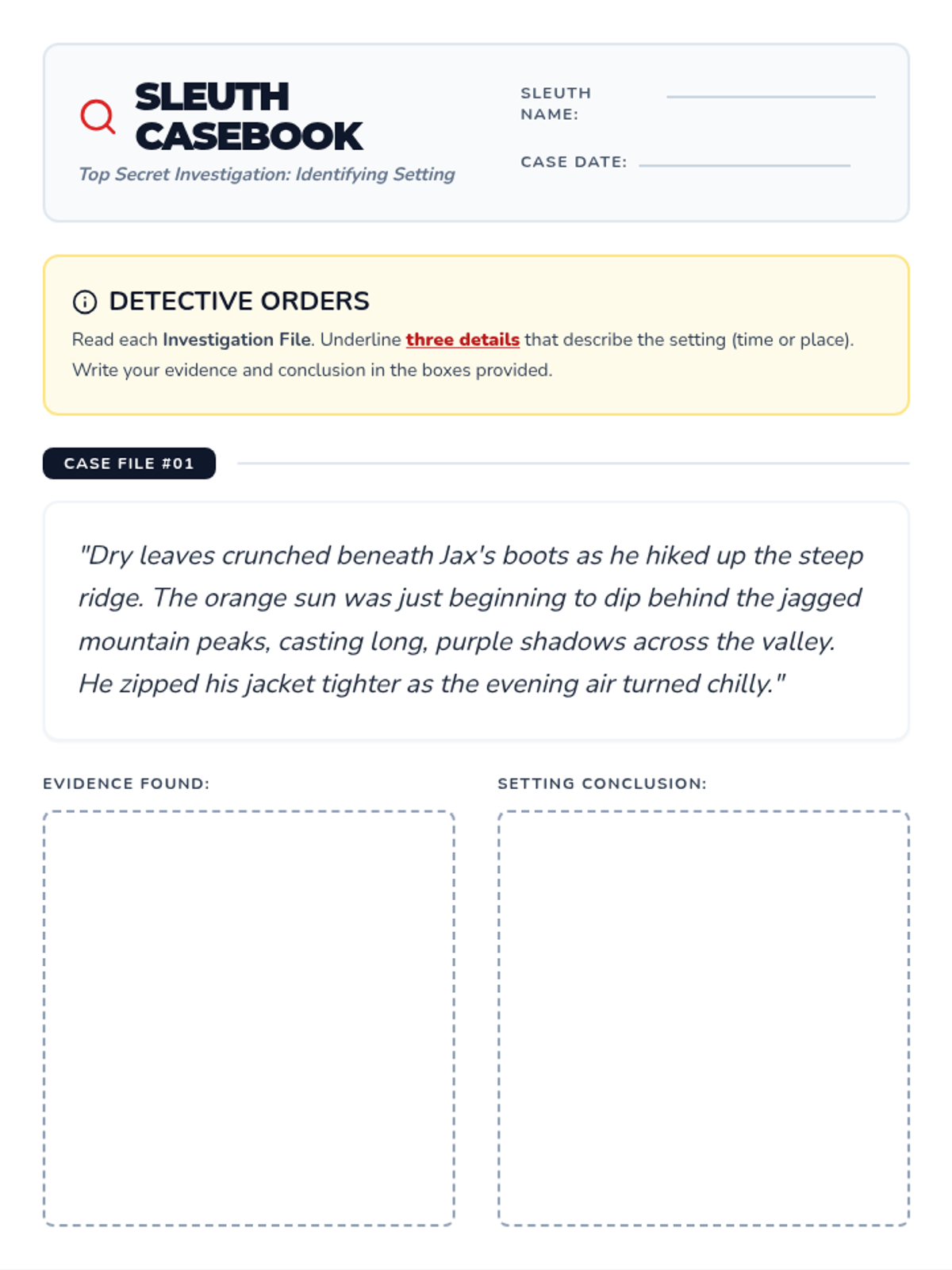 An engaging, detective-themed slide deck that teaches students how to identify setting (time and place) using sensory details and evidence from short passages. Revised to fix overflow and contrast issues.