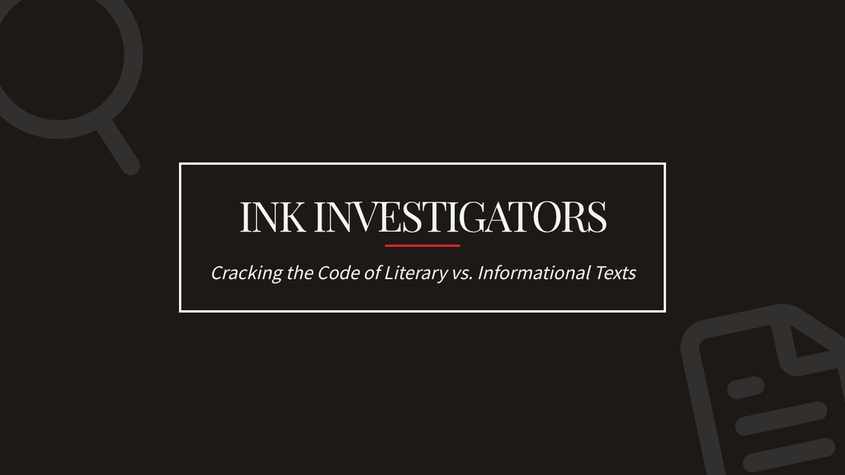A detective-themed slide deck that teaches students to distinguish between literary and informational texts by examining their purpose, DNA (features), and language styles.