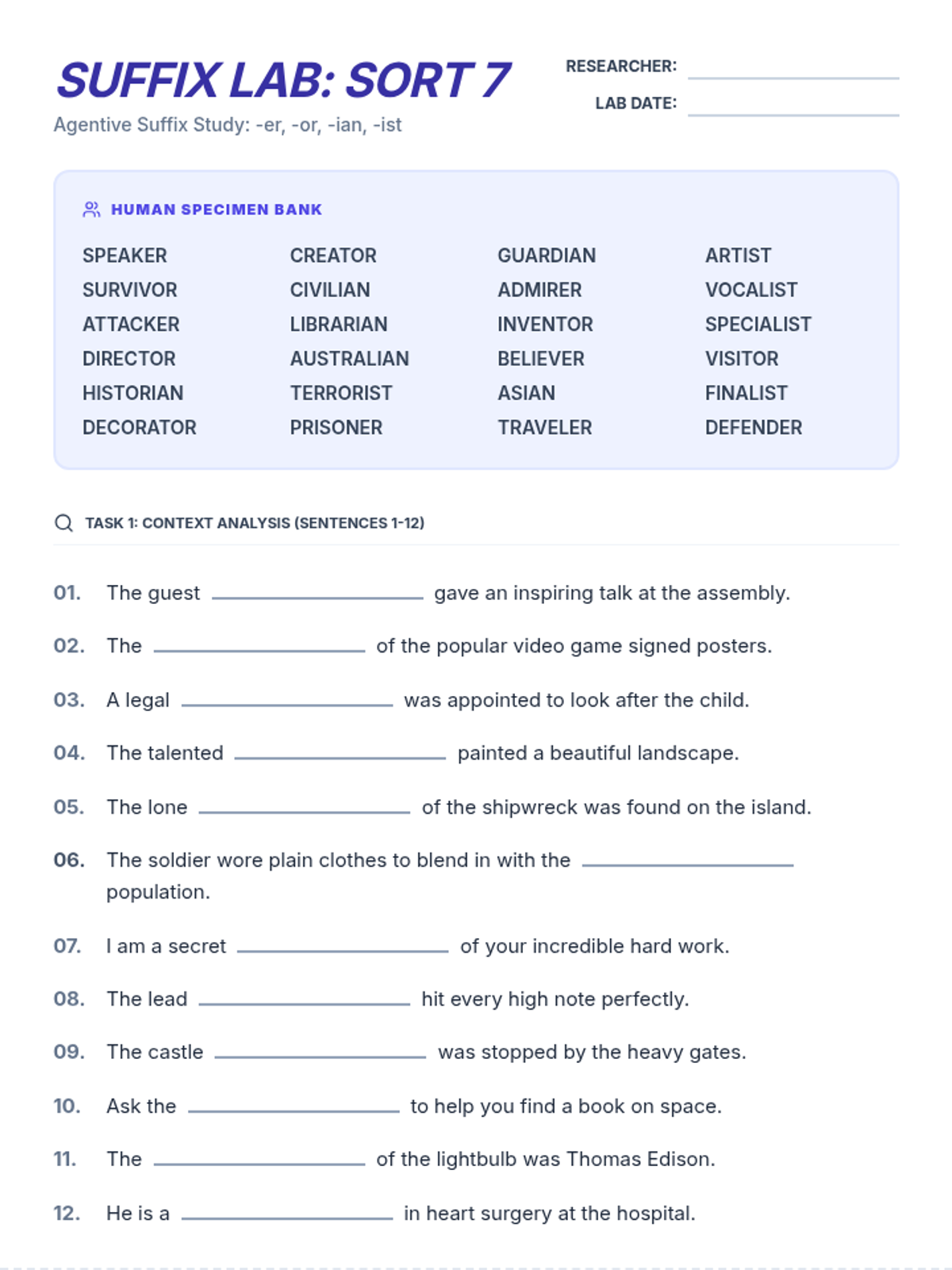 A 3-page printable packet for Sort 7 (-er, -or, -ian, -ist). Includes 24 fill-in-the-blank sentences across two pages, followed by a logic page with 6 word unscrambles and a crossword-style list.