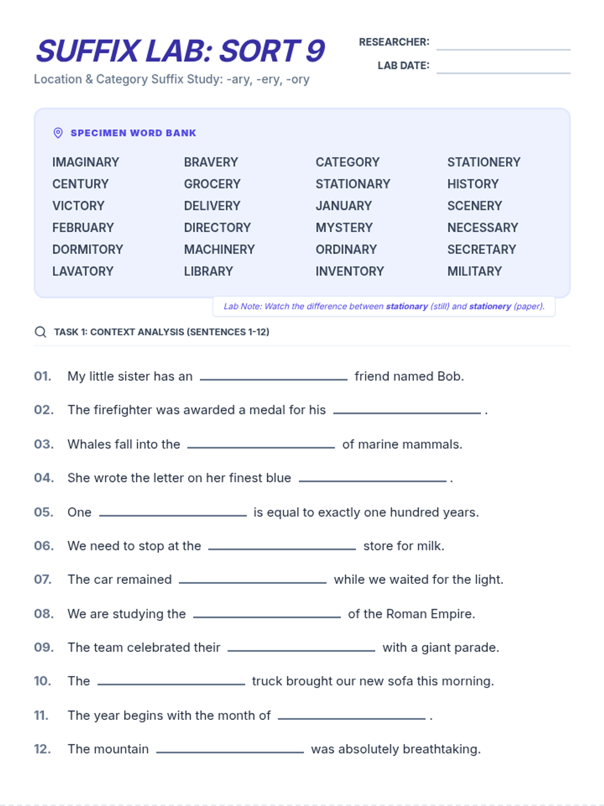 A 3-page printable packet for Sort 9 (-ary, -ery, -ory). Includes 24 fill-in-the-blank sentences across two pages, followed by a logic page with 6 word unscrambles and a crossword-style list.