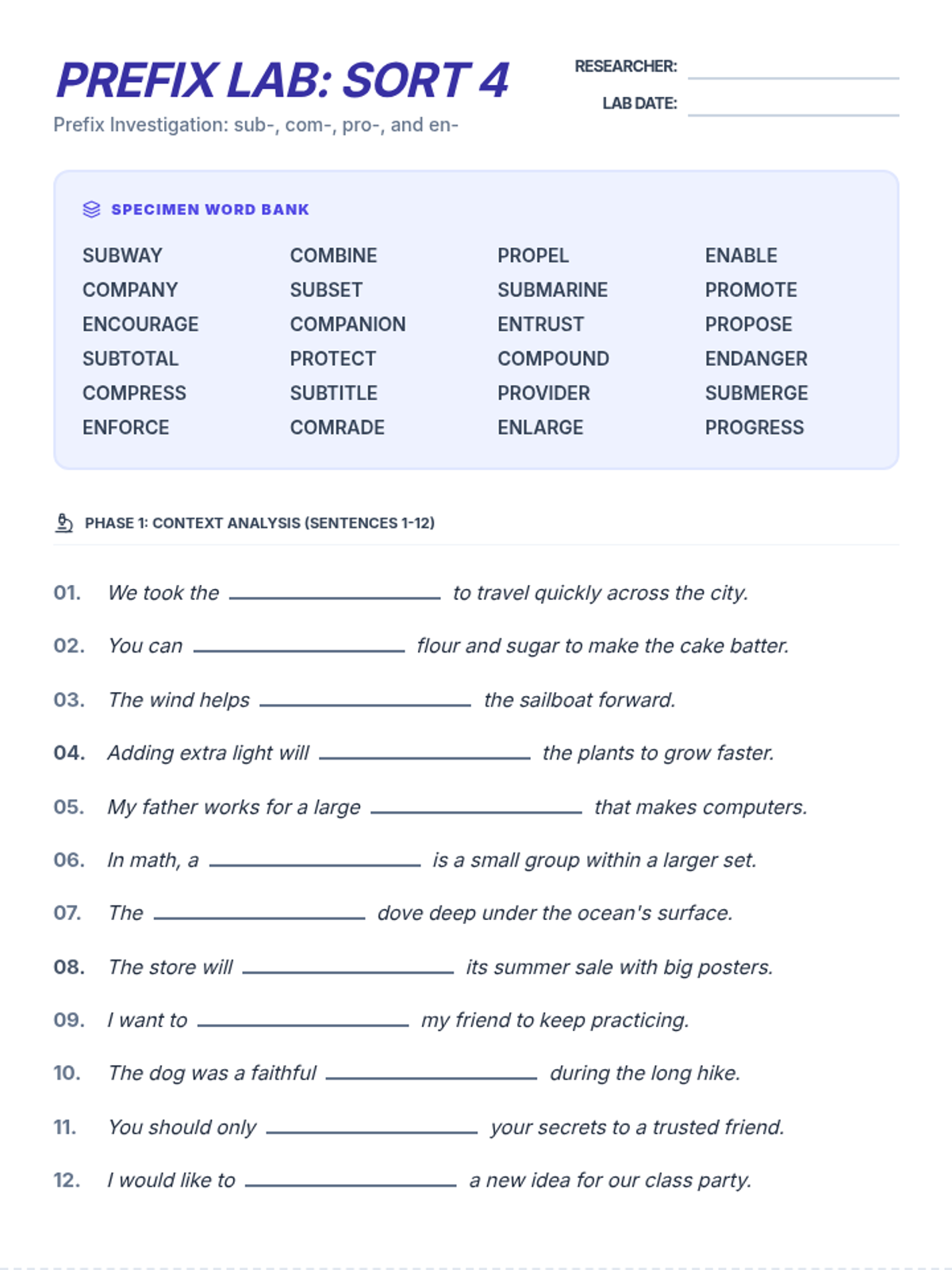 A 3-page printable packet for Sort 4 (sub-, com-, pro-, en-). Includes 24 fill-in-the-blank sentences across two pages, followed by a logic page with 6 word unscrambles and a 12x12 crossword puzzle.