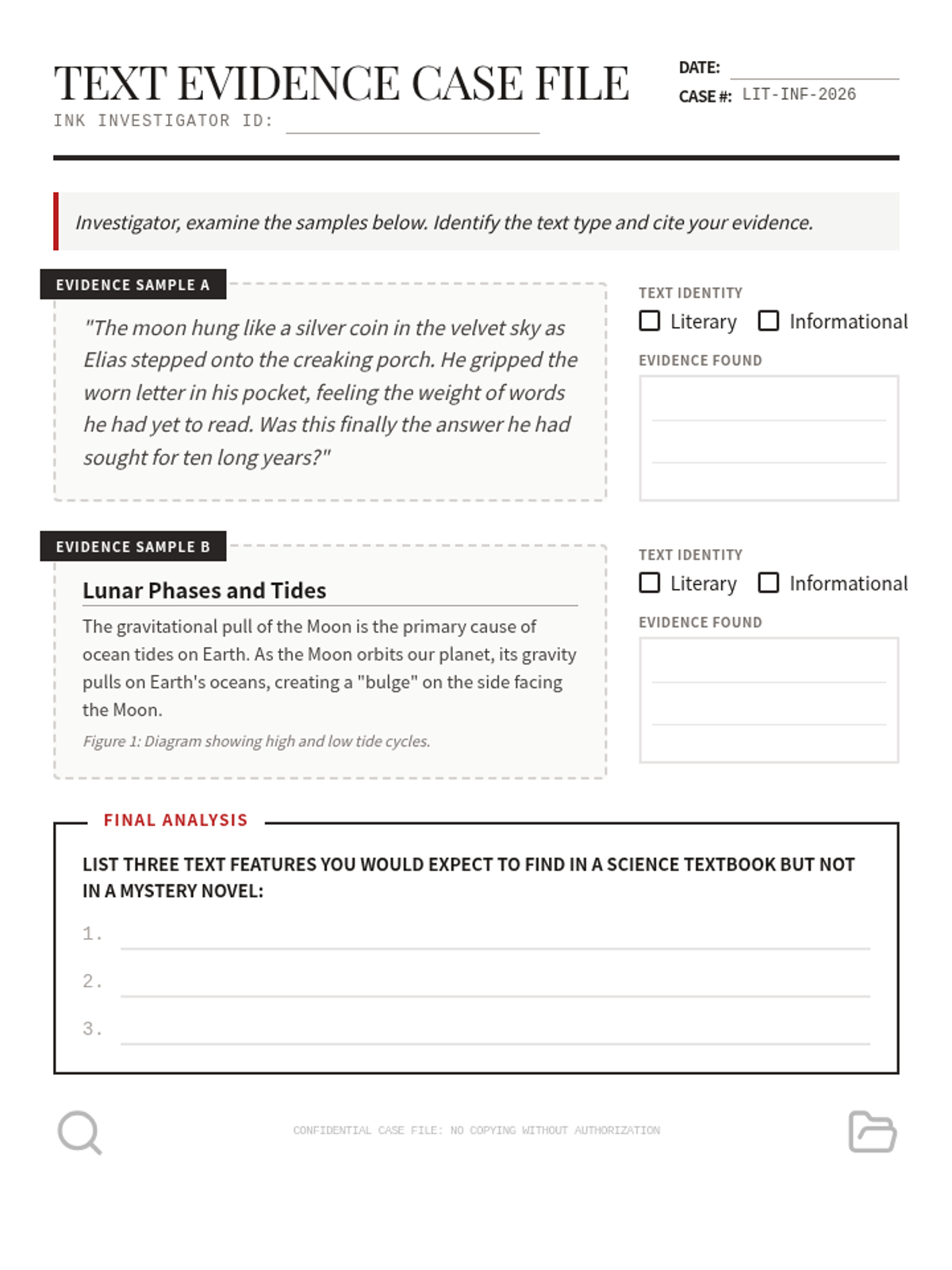 A detective-themed worksheet where students investigate text samples to determine if they are literary or informational, citing evidence for their findings. Optimized for single-page layout.