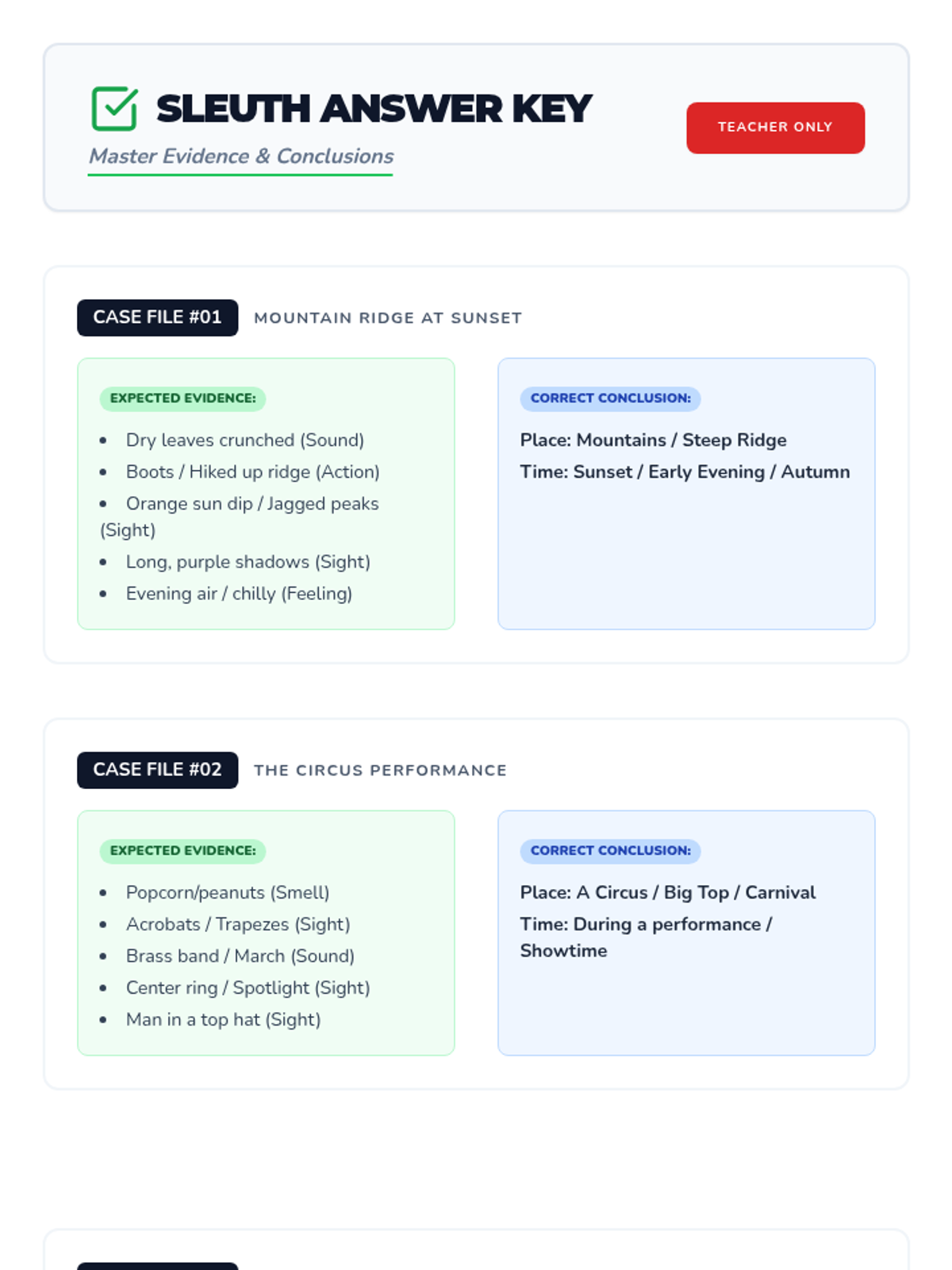 An answer key for the Sleuth Casebook worksheet. Revised to fix contrast, toner efficiency, and ensure clean page breaks. Case File #03 is now correctly placed on the second page for a clean layout.