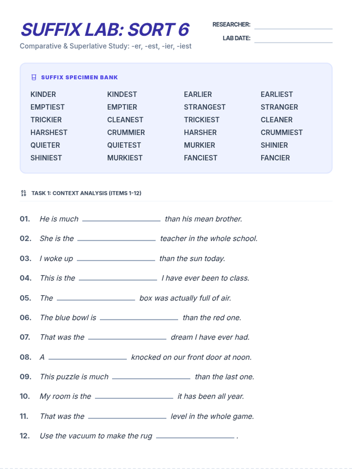 A 3-page printable packet for Sort 6 (-er, -est, -ier, -iest). Includes 24 fill-in-the-blank sentences across two pages, followed by a logic page with 6 word unscrambles and a 12x12 crossword puzzle.