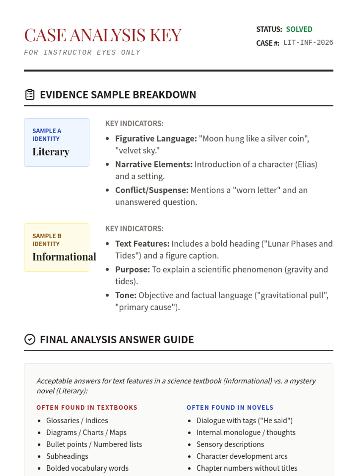 A teacher-facing answer key and analysis guide for the Text Evidence Case File worksheet. Revised for better page breaks.