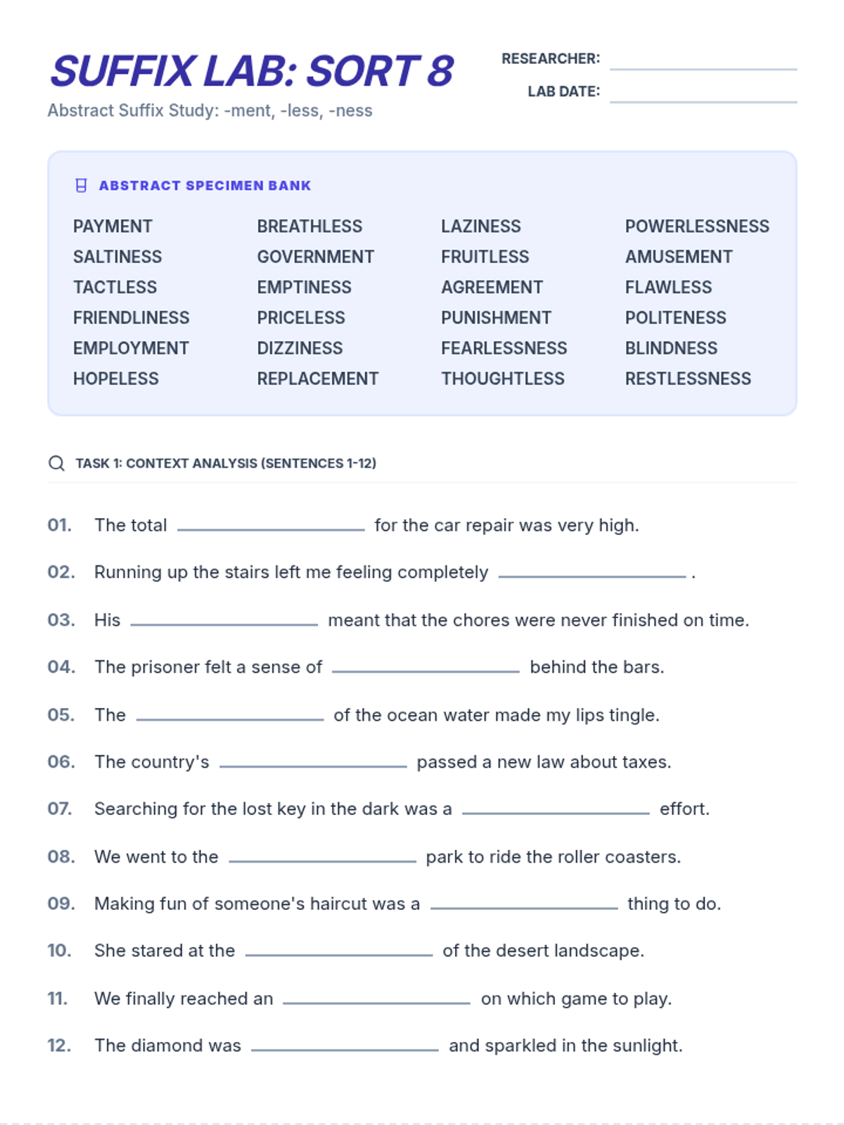 A 3-page printable packet for Sort 8 (-ment, -less, -ness). Includes 24 fill-in-the-blank sentences across two pages, followed by a logic page with 6 word unscrambles and a crossword-style list.