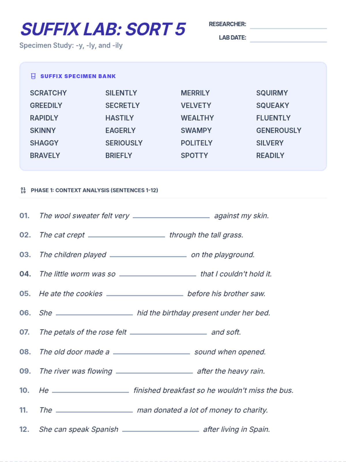 A 3-page printable packet for Sort 5 (-y, -ly, -ily). Includes 24 fill-in-the-blank sentences across two pages, followed by a logic page with 6 word unscrambles and a 12x12 crossword puzzle.