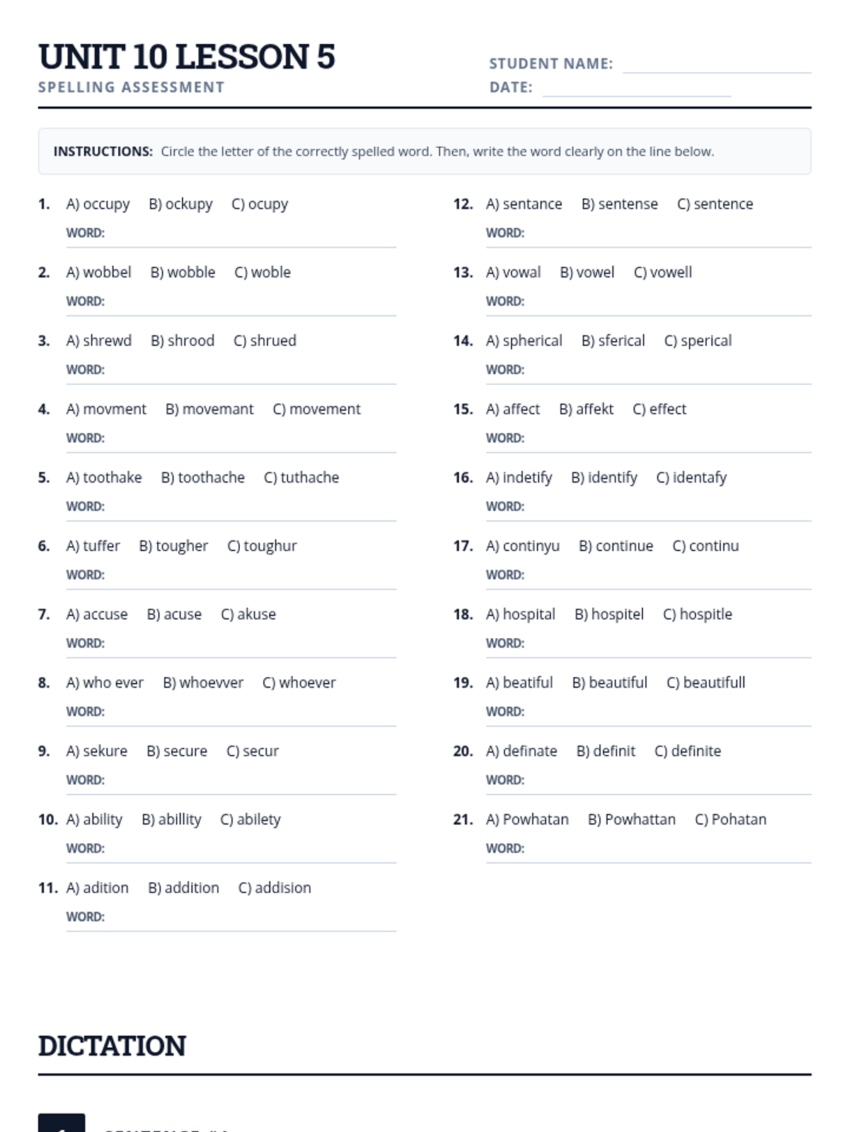A formal spelling assessment for Unit 10 Lesson 5 with 21 multiple-choice questions and a dictation section. Two-page layout providing ample workspace for student answers.