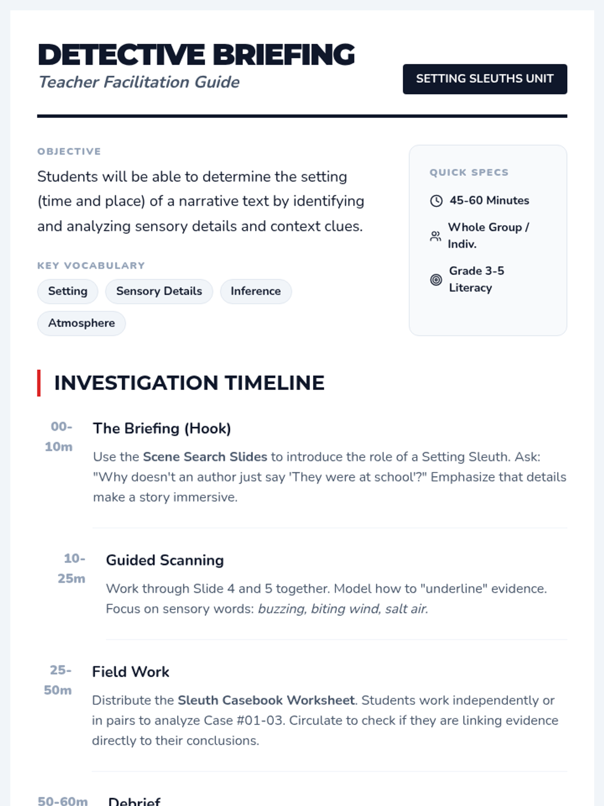 A comprehensive teacher guide for the Setting Sleuths lesson, including pacing, lesson objectives, vocabulary, and differentiation strategies.