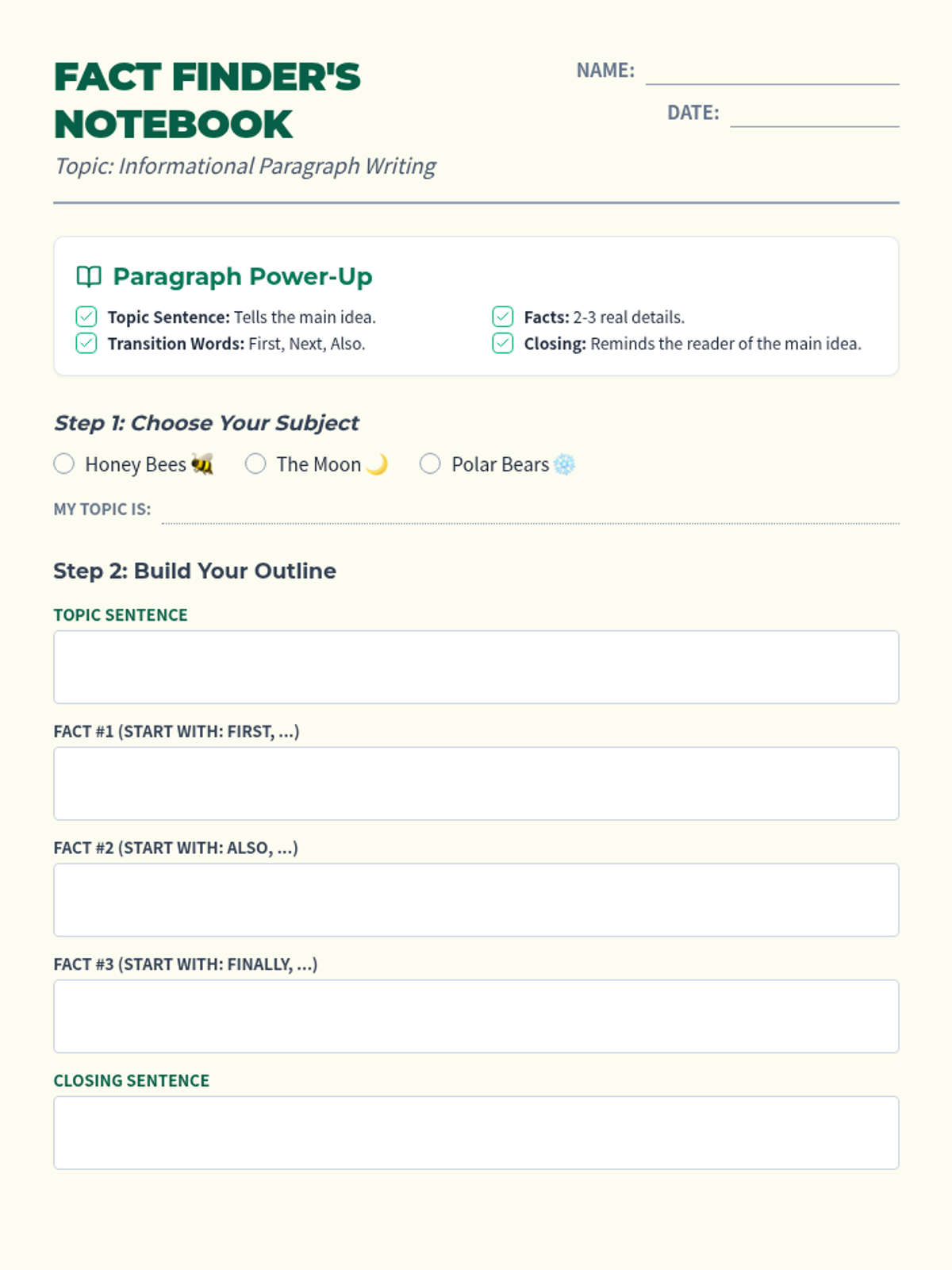 An informational paragraph writing worksheet for 3rd-grade students featuring a "Fact Finder's Notebook" theme. It includes a structured guided outline for topic sentences, facts, and conclusions, followed by a final drafting area with spacious writing lines.