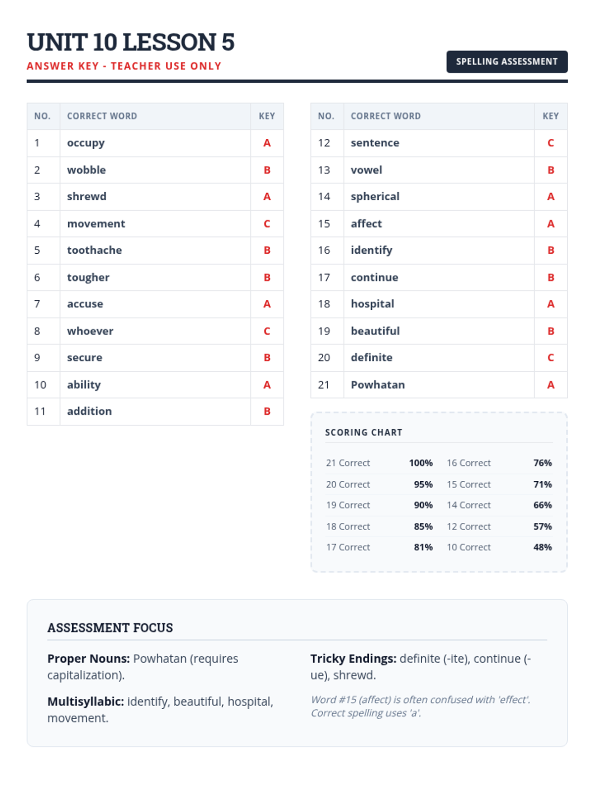 A clear teacher answer key for the 21-word Unit 10 Lesson 5 Spelling Test. Includes updated scoring chart and focus notes covering proper nouns and multisyllabic words.