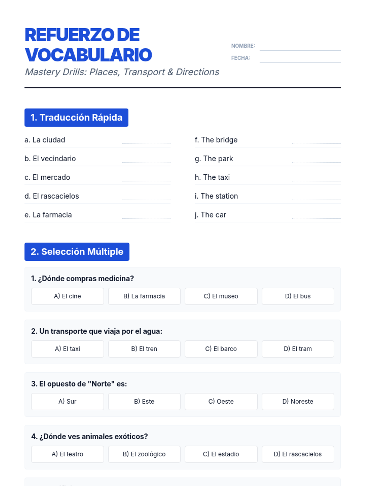 A vocabulary reference handout for students featuring Spanish city terms, transportation, and directions with English translations.