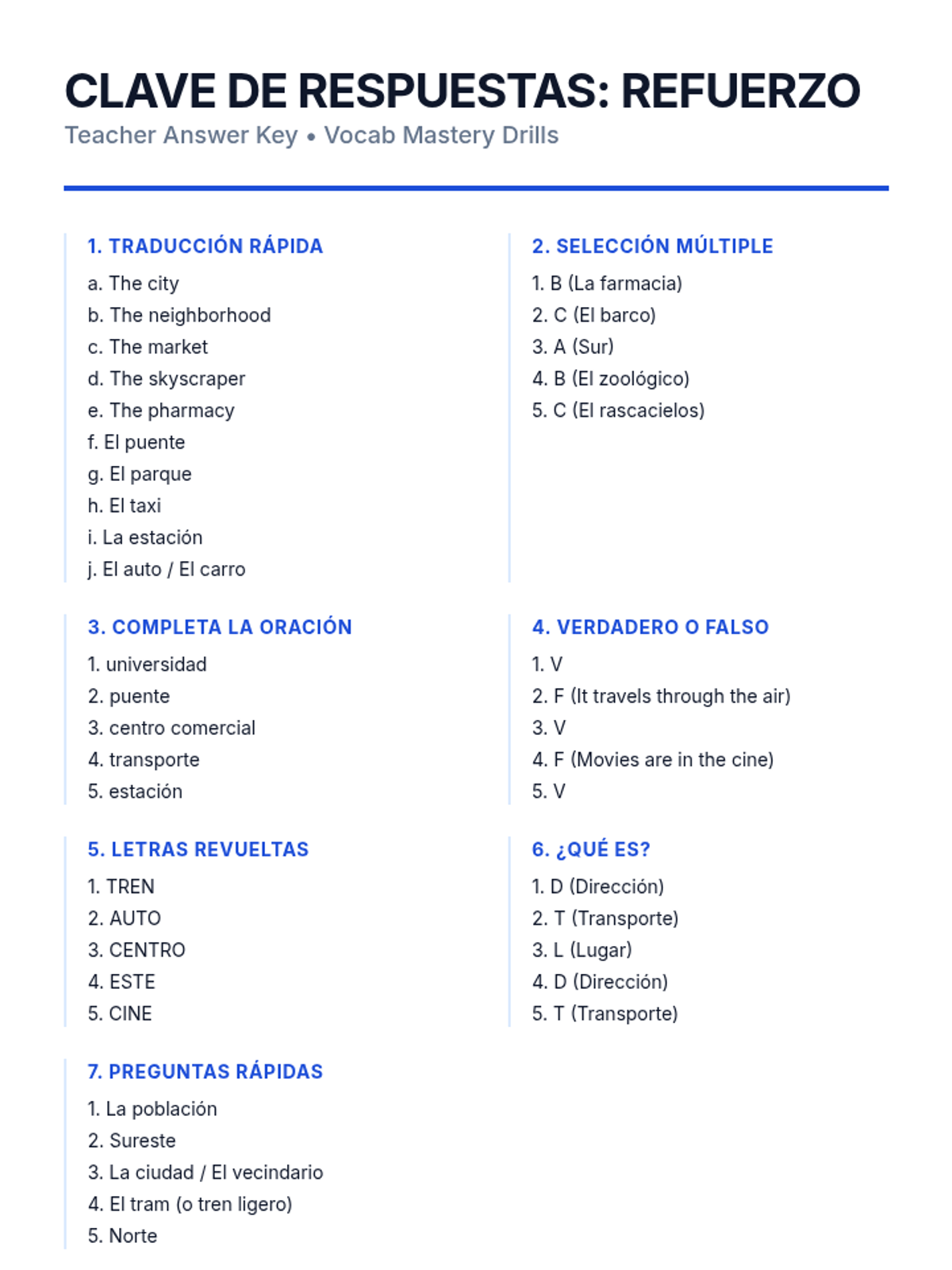 Comprehensive answer key for the "Barrio Beats" unit. Provides correct answers for vocabulary labels, verb conjugations, logic puzzles, matching activities, and the listening assessment.
