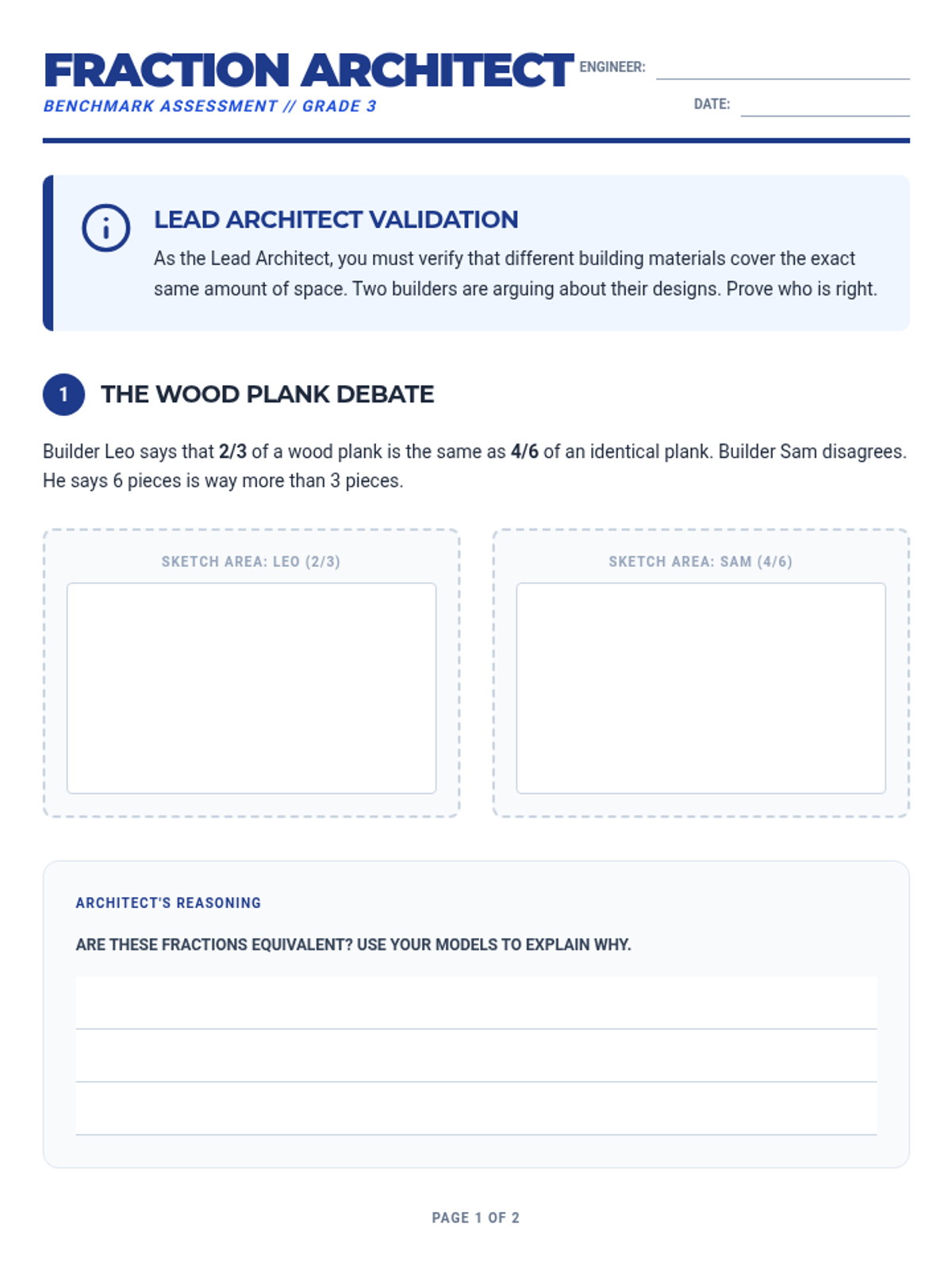 A Depth of Knowledge 4 assessment for grade 3 students on equivalent fractions. Students are challenged to model and explain why different fractional representations are equivalent through an architectural blueprint scenario.