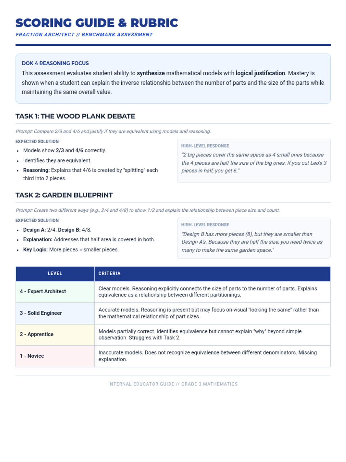 A teacher-facing scoring guide and rubric for the Fraction Architect assessment. It provides high-level reasoning examples and a 4-point rubric focused on DOK 4 cognitive complexity.
