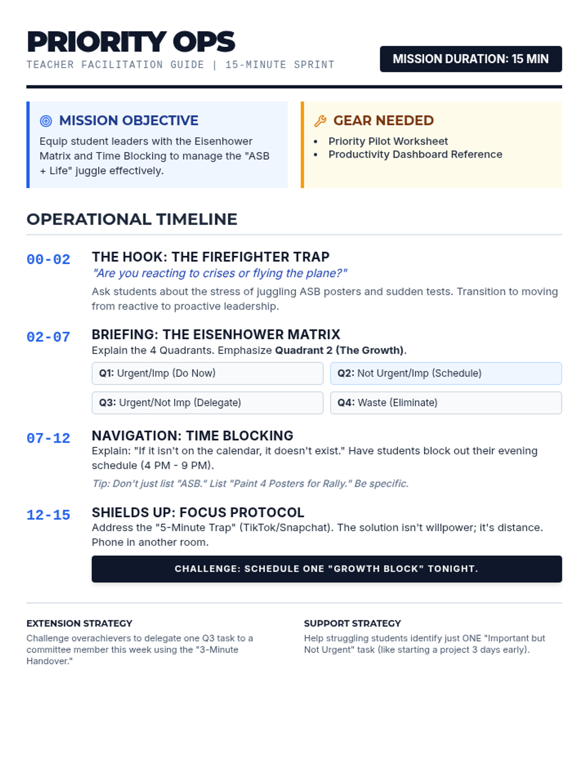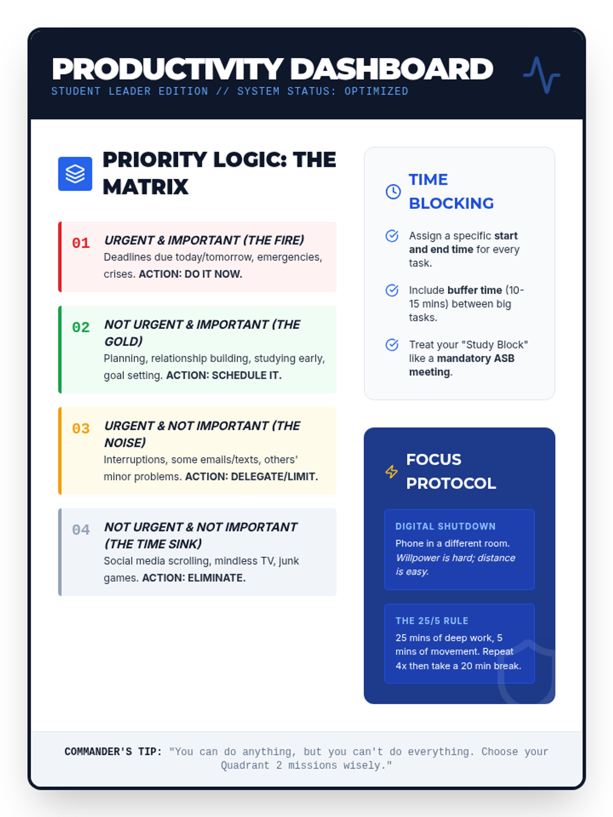 A high-density, one-page reference guide for time management, visually summarizing the Eisenhower Matrix, time-blocking principles, and digital focus protocols for student leaders.
