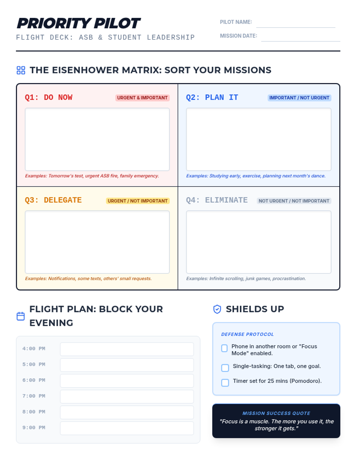 An interactive student worksheet featuring an Eisenhower Matrix for prioritization, a time-blocking evening schedule, and a digital distraction checklist.
