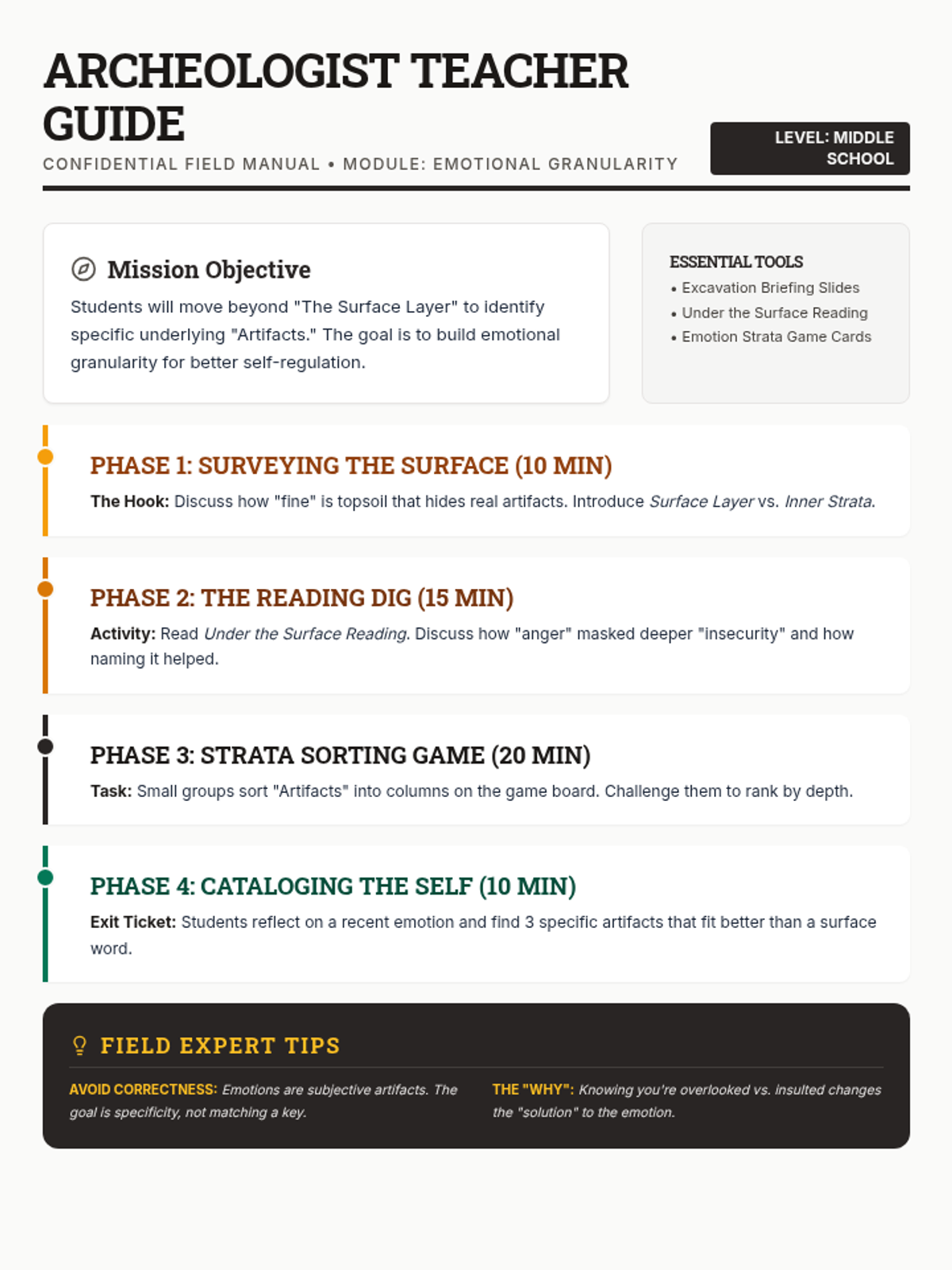 A teacher-facing lesson plan designed as an 'Artifact Guide,' providing a structured 4-phase approach to teaching emotional granularity using an archeology theme. Consolidated to 1-2 pages with efficient layout. Updated for better flow between phases and tools list.