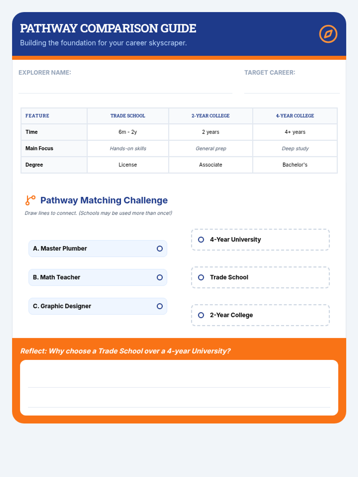 A comparison guide and worksheet for educational pathways including trade schools, 2-year colleges, and 4-year universities. Includes a feature table and a professional-to-school matching activity.