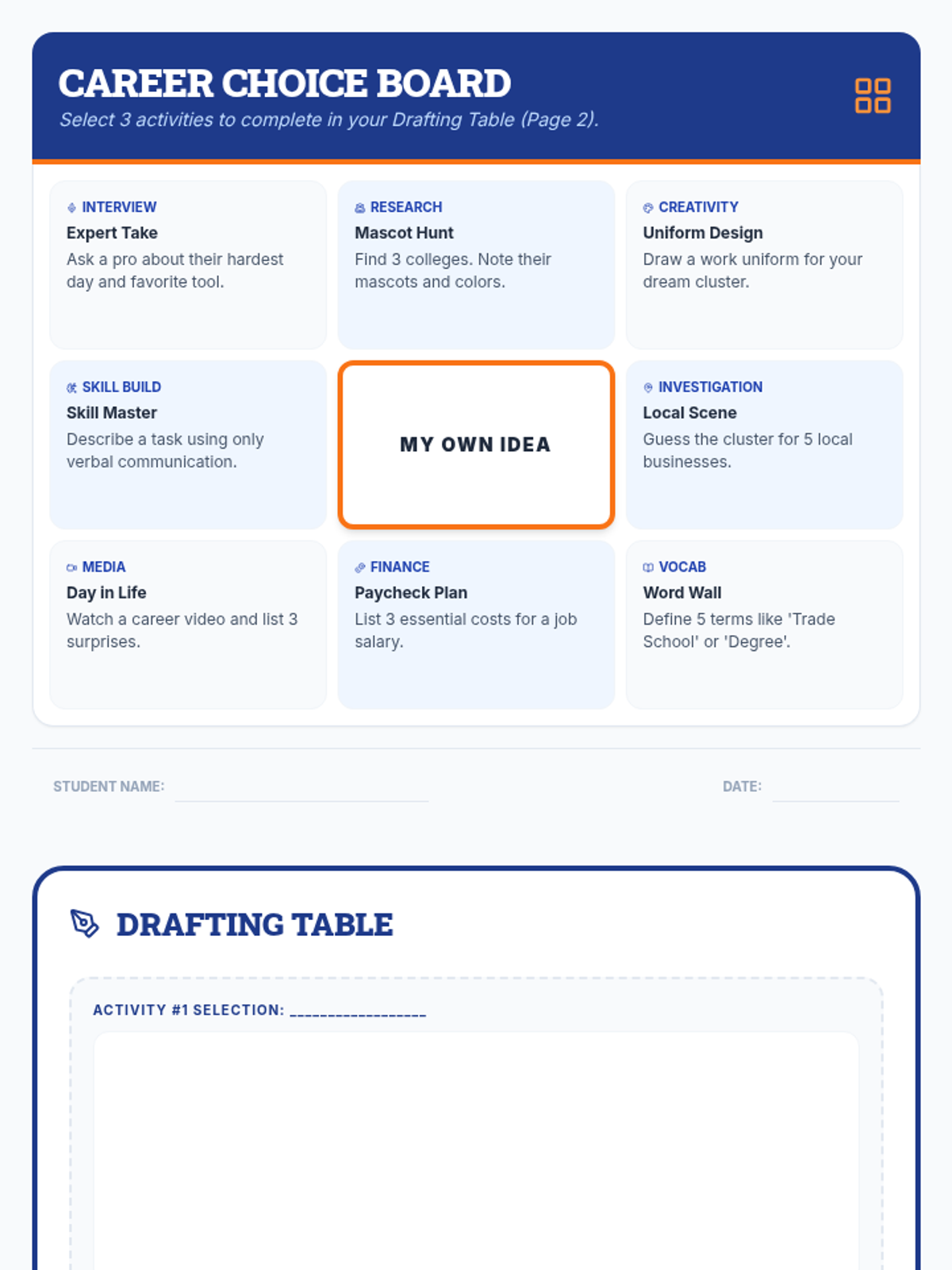 A career exploration choice board featuring nine engaging activities for students to choose from, including interviews, research, creativity, and skill-building exercises. Includes a dedicated response page.