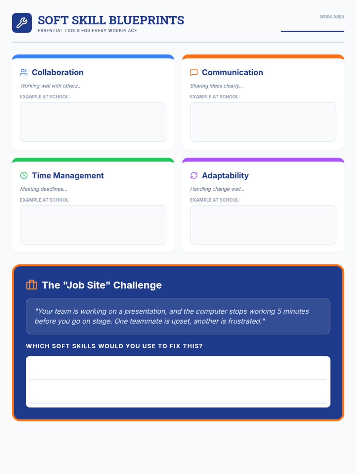 A worksheet for exploring and identifying soft skills essential for the workplace. Includes sections for collaboration, communication, time management, and adaptability with a workplace scenario challenge.